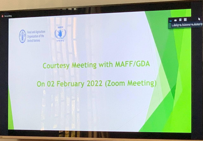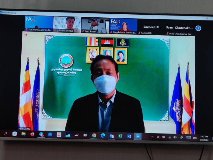 នៅអគ្គនាយកដ្ឋានកសិកម្ម នារសៀលថ្ងៃទី០២ ខែកុម្ភៈ ឆ្នាំ២០២២ ឯកឧត្តមបណ្ឌិត ងិន ឆាយ ប្រតិភូរាជរដ្ឋាភិបាលកម្ពុជាទទួលបន្ទុកជាអគ្គនាយកនៃអគ្គនាយកដ្ឋានកសិកម្ម អមដោយលោកប្រធាននាយកដ្ឋានដំណាំស្រូវ លោកប្រធាននាយកដ្ឋានសាកវប្បកម្ម និងដំណាំរួមផ្សំ និងសហការីបានអញ្ជើញចូលរួមក្នុងកិច្ចប្រជុំតាមរយៈប្រព័ន្ធអនឡាញជាមួយលោក Antonio Schiavone តំណាងអង្គការស្បៀងនិងកសិកម្មនៃសហប្រជាជាតិ (FAO) និងក្រុមការងារ និង Mr. Yohan Chambaud តំណាងកម្មវិធីស្បៀងអាហារពិភពលោក (WFP) និងក្រុមការងារ។ កិច្ចប្រជុំនេះត្រូវបានរៀបចំឡើងដើម្បី ១). ជួបសំដែងការគួរសមជូនចំពោះឯកឧត្តមប្រតិភូពីសំណាក់តំណាង FAO និង WFP ២). ជម្រាបជូនដោយសង្ខេបនូវគម្រោងស្តីពីជំនួយបច្ចេកទេសដល់កសិករ និងអ្នកផ្គត់ផ្គង់ស្បៀងអាហារលើការងារពង្រឹងសមត្ថភាពក្នុងផលិតកម្មដោយផ្សាភ្ជាប់ជាមួយនឹងកម្មវិធីផ្តល់អាហារតាមសាលារៀនដោយប្រើកសិផលក្នុងសហគមន៍ (Technical Assistance to Producers and Suppliers on Enhancing Production Capacity to Engage with Home Grown School Feed, HGSF) និង ៣). ស្វែងរកកិច្ចសហប្រតិបត្តិការជាមួយស្ថាប័នពាក់ព័ន្ធ រួមមាន ក្រសួងកសិកម្ម រុក្ខាប្រមាញ់ និងនេសាទ/អគ្គនាយកដ្ឋានកសិកម្ម និងមន្ទីរកសិកម្ម រុក្ខាប្រមាញ់ និងនេសាទខេត្តក្នុងការអនុវត្តគម្រោងនេះ។
