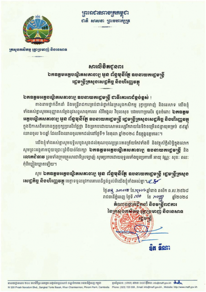 សារលិខិតជូនពរ ពីឯកឧត្តម ឌិត ទីណា រដ្ឋមន្រ្តីក្រសួងកសិកម្ម រុក្ខាប្រមាញ់ និងនេសាទ ផ្ញើជូន ឯកឧត្តមអគ្គបណ្ឌិតសភាចារ្យ អូន ព័ន្ធមុនីរ័ត្ន ឧបនាយករដ្ឋមន្ត្រី រដ្ឋមន្ត្រីក្រសួងសេដ្ឋកិច្ច និងហិរញ្ញវត្ថុ ក្នុងឱកាសចម្រើនជន្មាយុគម្រប់៥៩ ឆ្នាំ ឈានចូល៦០ឆ្នាំ