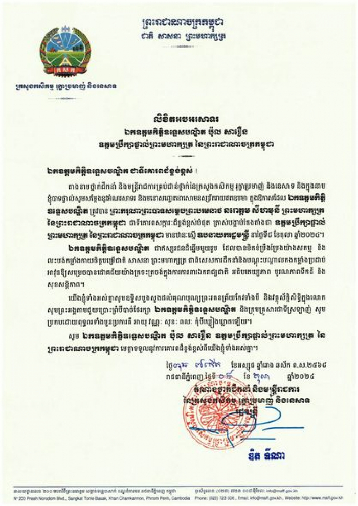 សារលិខិតអបអរសាទរ ពីឯកឧត្តម ឌិត ទីណា រដ្ឋមន្រ្តីក្រសួងកសិកម្ម រុក្ខាប្រមាញ់ និងនេសាទ ផ្ញើជូន ឯកឧត្តមកិត្តិឧទ្ទេសបណ្ឌិត ប៉ុល សារឿន ក្នុងឱកាសដែលឯកឧត្តមត្រូវបាន ព្រះករុណាព្រះបាទសម្តេចព្រះបរមនាថ នរោត្តម សីហមុនី ព្រះមហាក្សត្រ នៃព្រះរាជាណាចក្រកម្ពុជា ជាទីគោរពសក្ការៈដ៏ខ្ពង់ខ្ពស់បំផុត ត្រាស់បង្គាប់តែងតាំងជា "ឧត្តមប្រឹក្សាផ្ទាល់ព្រះមហាក្សត្រ នៃព្រះរាជាណាចក្រកម្ពុជា"
