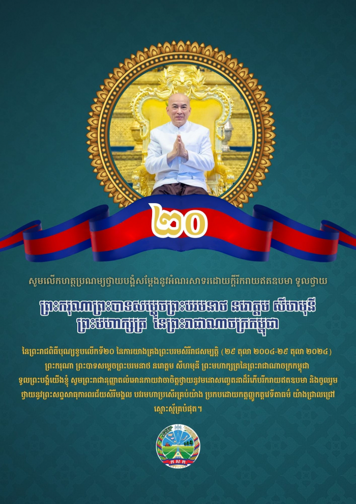 សូមថ្វាយព្រះសព្ទសាធុការពរ ព្រះករុណាជាអម្ចាស់ជីវិតលើត្បូង ព្រះបាទសម្តេចព្រះបរមនាថ ព្រះចៅក្នុងកម្ពុជាធិបតី ជាទីគោរពសក្ការៈដ៏ខ្ពង់ខ្ពស់បំផុត ក្នុងព្រះរាជវរោកាស ខួបទី២០ ការយាងគ្រងព្រះបរមសិរីរាជសម្បត្តិ (២៩ តុលា ២០០៤ - ២៩ តុលា ២០២៤)