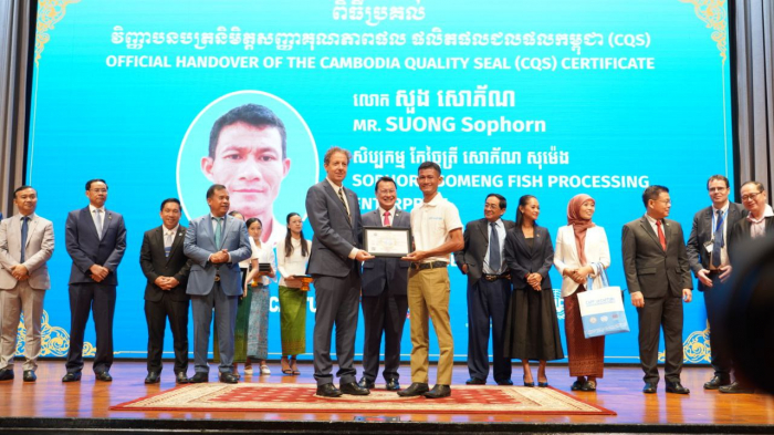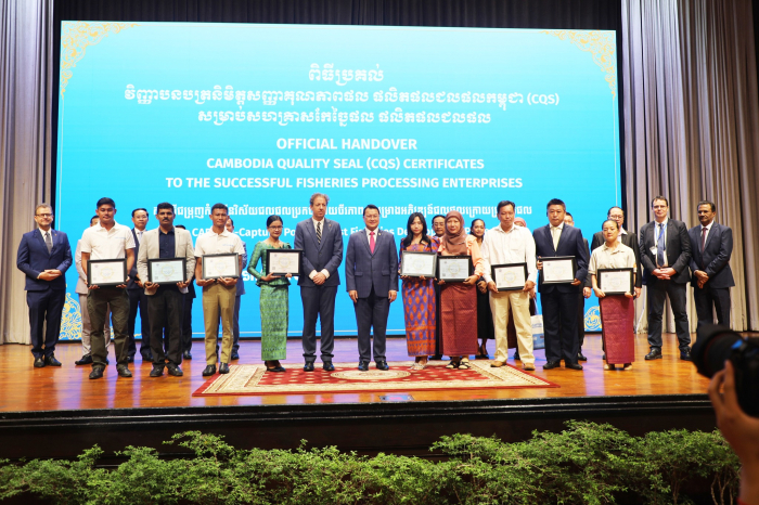 សូមជម្រាបជូនថា បន្ទាប់ពីការប្រកាសឱ្យដំណើរការជាផ្លូវការកម្មវធី ISF ឯកឧត្តមរដ្ឋមន្ត្រី បានផ្តល់កត្តិយសអញ្ជើញផ្តល់វិញ្ញាបនបត្រនិមិត្តសញ្ញាគុណភាពនៃផលិតផលជលផលកម្ពុជា(CQS) ដល់សហគ្រាសចំនួន ៩ផងដែរ៕