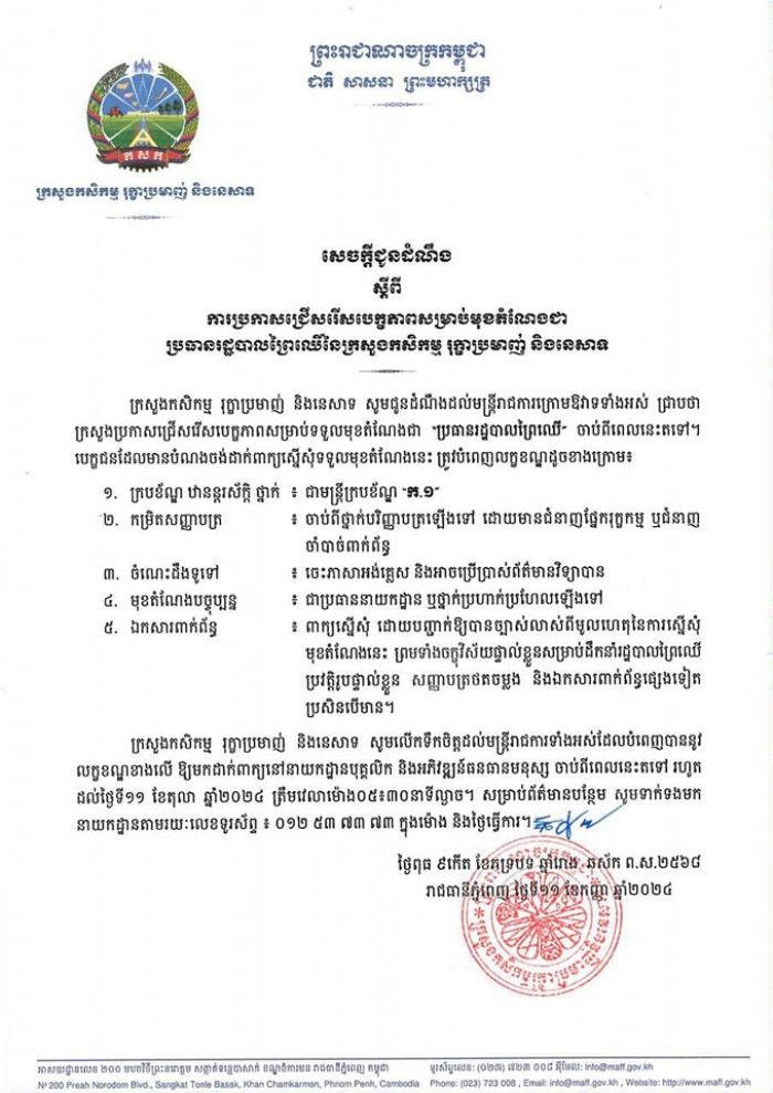 សេចក្តីជូនដំណឹង ស្តីពី ការប្រកាសជ្រើសរើសបេក្ខភាពសម្រាប់មុខតំណែងជាប្រធានរដ្ឋបាលព្រៃឈើនៃក្រសួងកសិកម្ម រុក្ខាប្រមាញ់ និងនេសាទ