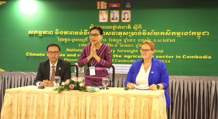 លោកជំទាវ ចាន់ ផលលឿន អនុរដ្ឋលេខាធិការ នៃក្រសួងកសិកម្ម អញ្ជើញជាអធិបតីភាពក្នុងសិក្ខាសាលាថ្នាក់ជាតិ ស្តីពីសកម្មភាព និងភាពធន់នឹងអាកាសធាតុ សម្រាប់វិស័យកសិកម្មនៅកម្ពុជា
