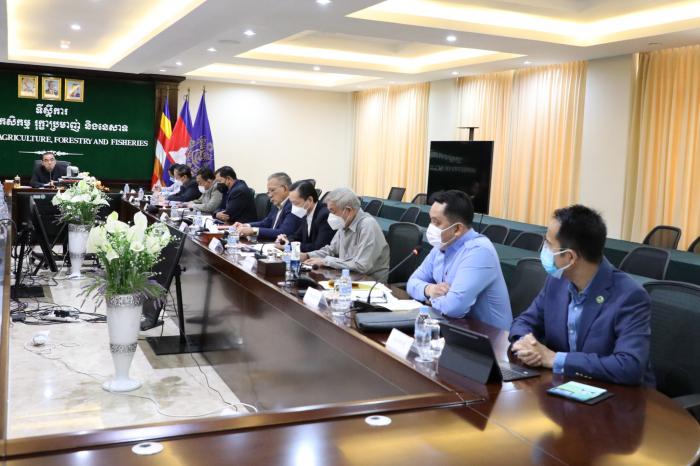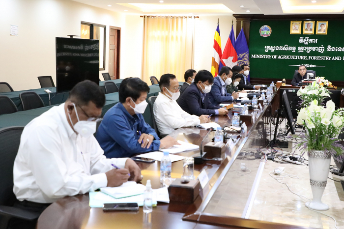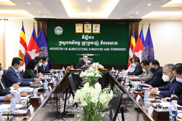 នៅថ្ងៃព្រហស្បតិ៍ ២កើត ខែមាឃ ឆ្នាំឆ្លូវ ត្រីស័ក ព.ស ២៥៦៥ ត្រូវនឹងថ្ងៃទី០៣ ខែកុម្ភៈ ឆ្នាំ២០២២ នាវេលាម៉ោង ៨:៣០នាទីព្រឹក ឯកឧត្តម វេង សាខុន រដ្ឋមន្រ្តីក្រសួងកសិកម្ម រុក្ខាប្រមាញ់ និងនេសាទ បានដឹកនាំកិច្ចប្រជុំចង្អៀតមួយ ដោយមានការចូលរួមពីថ្នាក់ដឹកនាំក្រសួង ដើម្បីពិនិត្យពិភាក្សាអំពីវឌ្ឍនភាព បញ្ហាប្រឈម នៃការងារកសិកម្ម រុក្ខាប្រមាញ់និងនេសាទ ក្នុងឆ្នាំកន្លងមក និងទិសដៅអនុវត្តបន្តក្នុងឆ្នាំ២០២២នេះ បន្ទាប់ពីក្រសួងបានបញ្ចប់កិច្ចប្រជុំបូកសរុបការងារប្រចាំឆ្នាំនៃអគ្គនាយកដ្ឋានទាំង៥ ក្រោមឱវាទក្រសួង ដើម្បីឆ្លើយតបទៅនឹងយុទ្ធសាស្រ្ត និងគោលនយោបាយកំណែទម្រង់ស៊ីជម្រៅរបស់រាជរដ្ឋាភិបាលក្នុងវិស័យកសិកម្ម។ ជាពិសេសបានចូលរួមយ៉ាងខ្ជាប់ខ្ជួនតាមការណែនាំរបស់រាជរដ្ឋាភិបាលនៅក្នុងសមរភូមិប្រយុទ្ធប្រឆាំងនិងជំងឺកូវីដ-១៩ ក្នុងព្រឹត្តិការណ៍សហគមន៍ ២០ កុម្ភៈ ២០២១ ដើម្បីរួមចំណែកធានានូវការវិលត្រឡប់ឱ្យបានឆាប់រហ័សទៅរកប្រក្រតីភាពថ្មីនៃជីវភាពរស់នៅប្រចាំថ្ងៃរបស់ប្រជាពលរដ្ឋទូទៅ។ សម្រាប់វិស័យកសិកម្ម ក្រសួងកសិកម្ម រុក្ខាប្រមាញ់ និងនេសាទ បានខិតខំឈ្មុសឈ្មុលរួមគ្នាធ្វើទំនើបកម្ម វិស័យកសិកម្មកម្ពុជា ស្របតាមគោលនយោបាយអភិវឌ្ឍន៍វិស័យកសិកម្មឆ្នាំ២០២១-២០៣០ ឲ្យមានលក្ខណៈប្រកួតប្រជែង បរិយាប័ន្ន ធន់នឹងការប្រែប្រួលអាកាសធាតុ និងនិរន្តរភាព បង្កើនប្រាក់ចំណូលគ្រួសារកសិករ វិបុលភាព និងសុខុមាលភាពរបស់ប្រជាពលរដ្ឋកម្ពុជា ដើម្បីប្រែក្លាយវិស័យកសិកម្មពីដំណាក់កាលនៃការអភិវឌ្ឍតាមបែបវិបុលកម្ម ពោលគឺពឹងផ្អែកជាសំខាន់លើធនធានដែលមានស្រាប់ ឈានទៅរកដំណាក់កាលថ្មីដែលផ្តោតលើប្រពលវប្បកម្ម ដោយគឺពឹងផ្អែកជាសំខាន់លើការប្រើប្រាស់បច្ចេកវិទ្យាថ្មីទំនើប និងការអភិវឌ្ឍយន្តូបនីយកម្ម ដើម្បីលើកកម្ពស់ផលិតភាព ពិពិធកម្មដំណាំដែលមានសក្តានុពល និងទីផ្សារ រួមទាំងការចិញ្ចឹមសត្វ និងវារីវប្បកម្មជាលក្ខណៈពាណិជ្ជកម្ម ធានាឲ្យបាននូវសន្តិសុខស្បៀង អាហារូបត្ថម្ភ បង្កើនការងារនៅមូលដ្ឋាន បង្កើនប្រាក់ចំណូលក្នុងគ្រួសារ សំដៅធានាឲ្យបាននូវបរិមាណផ្គត់ផ្គង់កសិផលប្រកបដោយគុណភាព និងសុវត្ថិភាព ស្របតាមស្តង់ដារតម្រូវការរបស់ទីផ្សារក្នុងស្រុក ក្នុងតំបន់ និងទីផ្សារអន្តរជាតិ ដើម្បីធ្វើការនាំចេញ និងការកាត់បន្ថយការនាំចូល។ នៅក្នុងឆ្នាំ២០២១នេះ ការងារអនុវិស័យកសិកម្ម អនុវិស័យផលិតកម្មសត្វ និងអនុវិស័យកៅស៊ូ មានវឌ្ឍនភាពគួរឲ្យកត់សម្គាល់ ជាពិសេសការនាំចេញផលិតផលទាំងនោះទៅក្រៅប្រទេសបើប្រៀបធៀបទៅនឹងឆ្នាំមុន រីឯអនុវិស័យជលផលមានការធ្លាក់ចុះបន្តិច។ ជាមួយនឹងវឌ្ឍនភាពដូចបានលើកឡើងខាងលើ ឯកឧត្តមរដ្ឋមន្