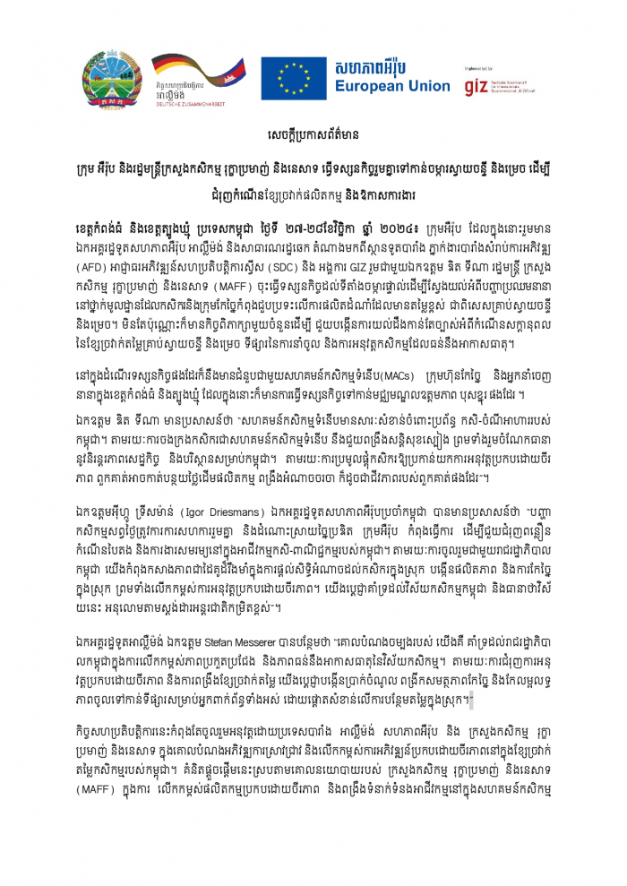 សេចក្តីប្រកាសព័ត៌មាន អំពីដំណើទស្សនកិច្ចរួមគ្នារបស់ ឯកឧត្តមរដ្ឋមន្ត្រីក្រសួងកសិកម្ម រុក្ខាប្រមាញ់ និងនេសាទ និងក្រុមអឺរ៉ុប ទៅកាន់ចម្ការស្វាយចន្ទី និងម្រេច ដើម្បីជំរុញកំណើនខ្សែច្រវាក់ផលិតកម្ម និងឱកាសការងារ។