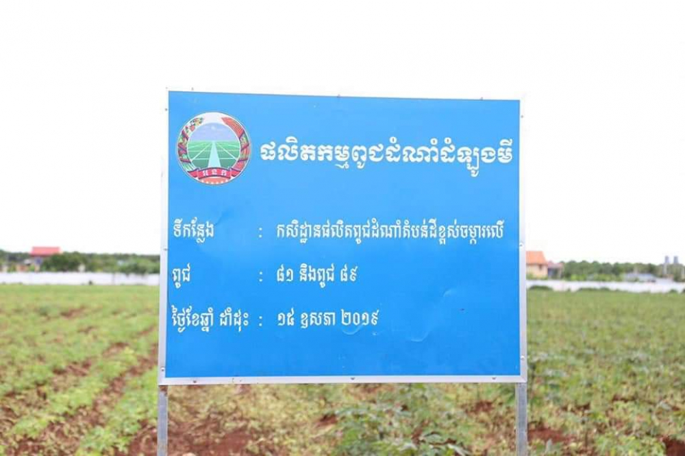 ឯកឧត្តមរដ្ឋមន្រ្តី អមដំណើរដោយសហការីបានអញ្ជើញមកដាំដំឡូងមីនៅកសិដ្ឋានផលិតពូជដំណាំតំបន់ដីខ្ពស់ចម្ការលើ និងជួបសំណេះសំណាលជាមួយមន្រ្តី បុគ្គលិក និងកម្មករដែលបម្រើ ការក្នុងកសិដ្ឋាននេះ ដែលមានទីតាំងស្ថិតនៅភូមិចម្កាលើ ក្នុងឃុំបុសខ្មុរ ស្រុកចម្ការលើ ខេត្តកំពង់ចាម។ សកម្មភាពនេះមានគោល បំណងចង់បង្ហាញដល់ប្រជា កសិករ ម្ចាស់ចម្ការ និងក្រុមហ៊ុមដែលដាំដំឡូងមីឲ្យយកចិត្តទុកដាក់អំពីពូជព្រោះថាបើមានការជ្រើសរើសពូជបានល្អនោះវានឹងផ្តល់ប្រយោជន៍សំខាន់ពីរយ៉ាងគឺ ទី១. ពូជល្អទិន្នផលកើនឡើង និងទី២.ពូជល្អគឺមានន័យថាគ្មានជំងឺឆ្លង ហើយក៏ចង់ជំរុញ និងគាំទ្រឲ្យអគ្គនាយកដ្ឋានកសិកម្មផលិតពូជដំឡូងមីមានគុណភាព មានផលិតភាពផលិតកម្មខ្ពស់ និងគ្មានជំងឺឆ្លងដើម្បីផ្សព្វផ្សាយពូជនេះជូនប្រជាកសិករនៅជុំវិញតំបន់នេះយកទៅធ្វើការដាំដុះ និងបន្តពង្រីកពូជដំឡូងមីឲ្យបានទូលំទូលាយទូទាំងប្រទេសឲ្យបានគ្រប់គ្រាន់ ឈានទៅកាត់បន្ថយបរិមាណនាំចូល និងជាពិសេសកាត់បន្ថយហានីភ័យនៃជំងឺឆ្លងដំឡូងមីម៉ូសាអ៊ិច។