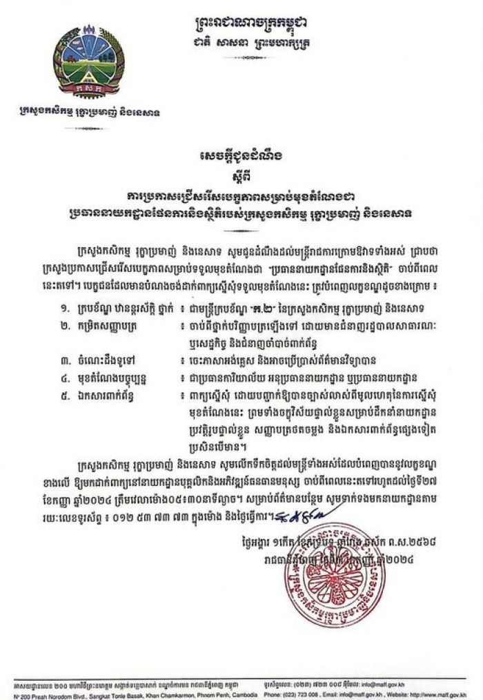 សេចក្តីជូនដំណឹង​ ស្តីពី ការប្រកាសជ្រេីសរេីសបេក្ខភាពសម្រាប់មុខតំណែងជាប្រធាននាយកដ្ឋានផែនការនិងស្ថិតិរបស់ក្រសួងកសិកម្ម​ រុក្ខាប្រ​មាញ់​ និងនេសាទ