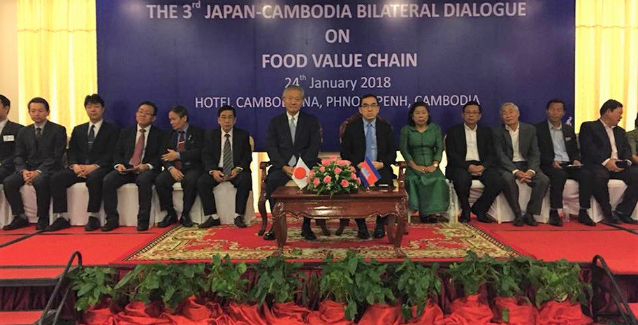 នៅសណ្ឋាគារ Cambodiana រាជធានីភ្នំពេញ,ថ្ងៃពុធ ៨កើត ខែមាឃ ឆ្នាំរកា នព្វស័ក ព.ស ២៥៦១ ត្រូវនឹងថ្ងៃទី២៤ ខែមករា ឆ្នាំ២០១៨ មានបើកកិច្ចសន្ទនាទ្វេភាគីកម្ពុជា-ជប៉ុនលើកទី៣ ស្ដីពី ខ្សែចង្វាក់តម្លៃផលិតកម្មស្បៀង...