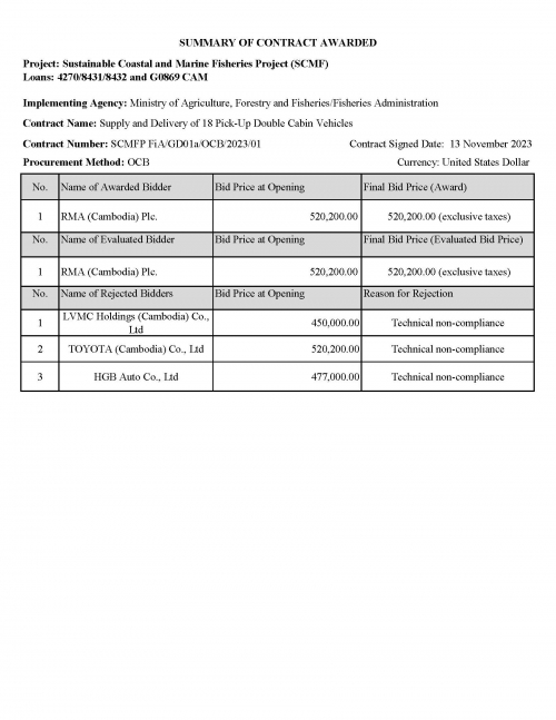 សេចក្តីជូនដំណឹង ស្តីពី សង្ខេបការវាយតម្លៃ និងប្រគល់កិច្ចសន្យារថយន្ត ចំនួន ១៨ គ្រឿង