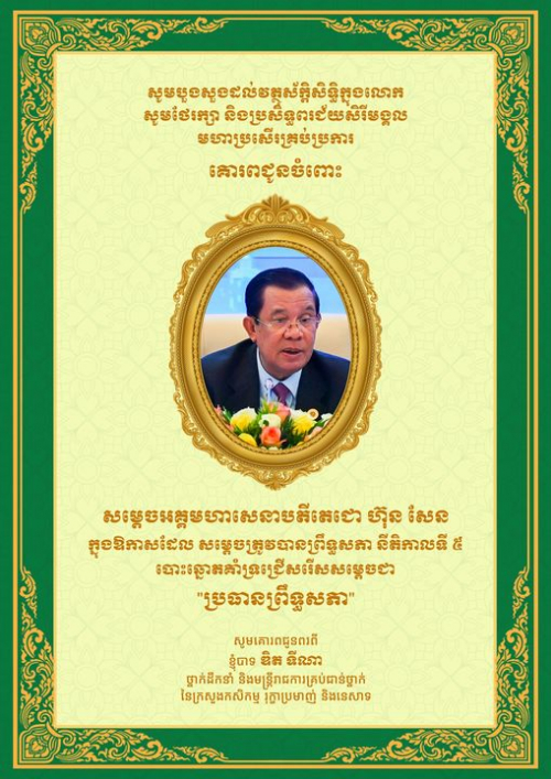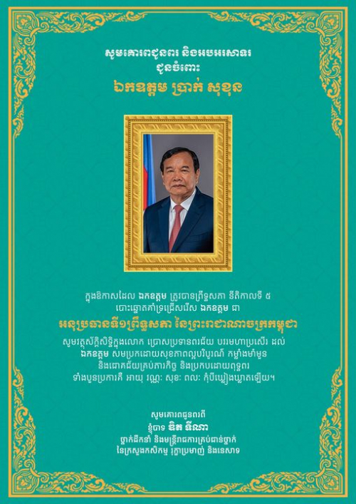 សូមគោរពអបអរសាទរ ឯកឧត្តម ប្រាក់ សុខុន ដែលត្រូវបានព្រឹទ្ធសភា នីតិកាលទី៥ បោះឆ្នោតជ្រើសរើស ឯកឧត្តម ជា « អនុប្រធានទី១ព្រឹទ្ធសភា » នៃព្រះរាជាណាចក្រកម្ពុជា ក្នុងនី...