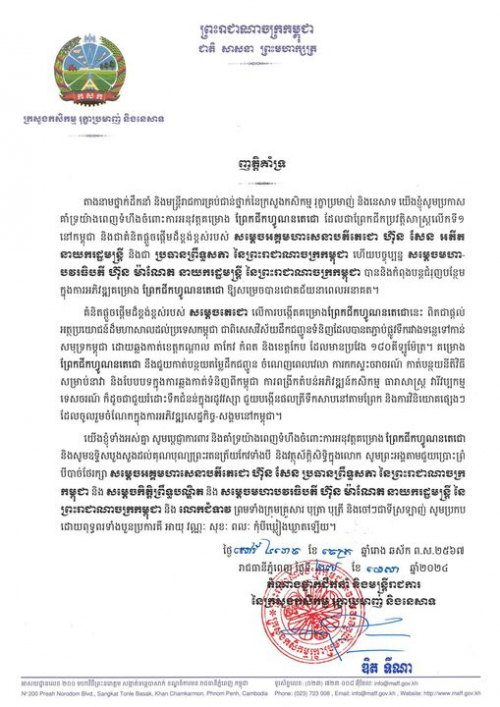 តាងនាមថ្នាក់ដឹកនាំ និងមន្ដ្រីរាជការគ្រប់ជាន់ថ្នាក់នៃក្រសួងកសិកម្ម រុក្ខាប្រមាញ់ និងនេសាទ យើងខ្ញុំសូមប្រកាស គាំទ្រយ៉ាងពេញទំហឹងចំពោះការអនុវត្តគម្រោង ព្រែកជីកហ្វូណនតេជោ...