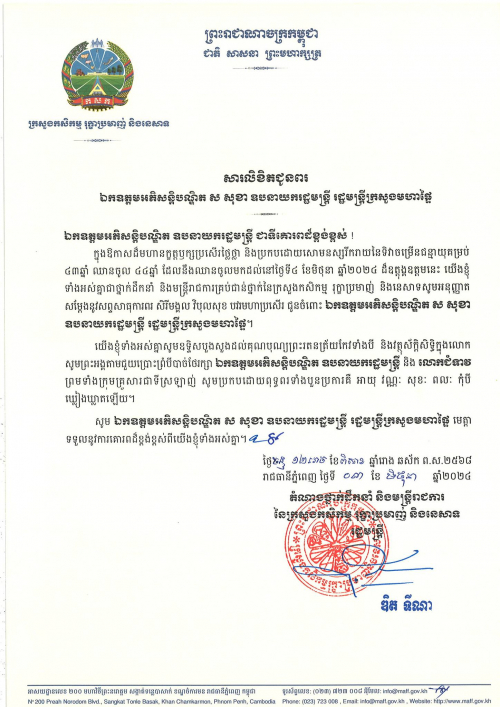 នៅរាត្រីថ្ងៃទី២៥ ខែមិថុនា ឆ្នាំ២០២៤នេះ វីដេអូផលិតដោយក្រសួងកសិកម្ម រុក្ខាប្រមាញ់ និងនេសាទ នឹងត្រូវចាក់បញ្ចាំងនៅក្នុងពិធីសម្ពោធមហោស្រពភាពយន្តអន្ដរជាតិកម្ពុជា...