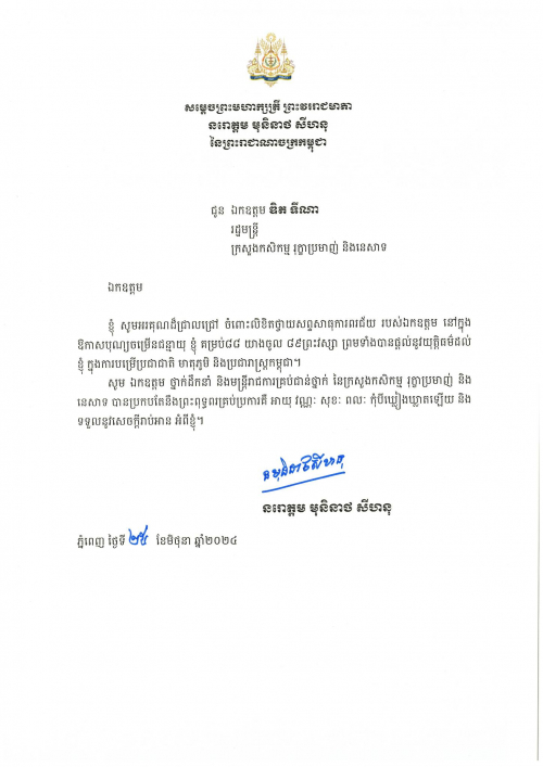 ព្រះរាជសារ សម្តេចមហាក្សត្រី ព្រះវររាជមាតា នរោត្តម មុនិនាថ សីហនុ ជូន ឯកឧត្តម ឌិត ទីណា រដ្ឋមន្ត្រីក្រសួងកសិកម្ម រុក្ខាប្រមាញ់ និងនេសាទ ចំំពោះលិខិតថ្វាយសព្ទសាធុការពរជ័យក្នុងឱកាសបុណ្យចម្រើនជន្មាយុគម្រប់...