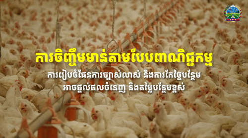 នៅកម្ពុជា តម្រូវការសាច់មាន់ទូទាំងប្រទេស មានចំនួនចាប់ពី១៥ម៉ឺន ទៅ១៦ម៉ឺនក្បាលក្នុង១ថ្ងៃ។ ដើម្បីធានាបាននូវស្ថិរភាពថ្លៃ និងទទួលបានផលចំណេញ ការចិញ្ចឹមមាន់ ទាំងការចិញ្ចឹមតាមបែបពាណិជ្ជកម្ម...