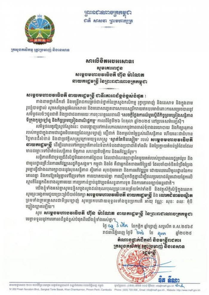 ជូនចំពោះ ឯកឧត្តម ឌិត ទីណា រដ្ឋមន្ត្រីក្រសួងកសិកម្ម រុក្ខាប្រមាញ់...