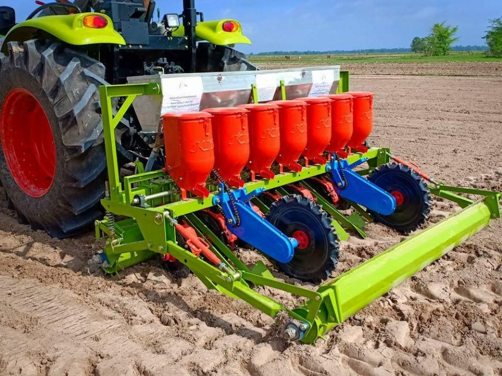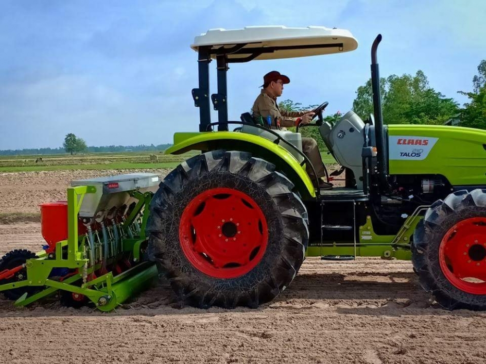 ១) ការបង្ហាញគ្រឿងយន្តកសិកម្មព្រោះស្រូវស្ងួត ដោយប្រើគ្រឿងយន្តកែឆ្នៃព្រោះស្រូវឈ្មោះ អេលី និង HCC