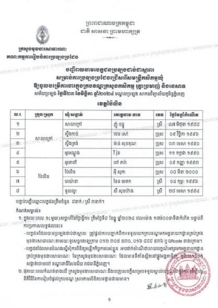 បញ្ជីរាយនាម បេក្ខជនប្រឡងជាប់ជាស្ថាពរនៃការប្រឡងប្រជែងជ្រើសរើសមន្ត្រីកសិកម្មឃុំ ឱ្យចូលបម្រើការងារក្នុងក្របខណ្ឌក្រសួងកសិកម្ម រុក្ខាប្រមាញ់ និងនេសាទ ខេត្តប៉ៃលិន