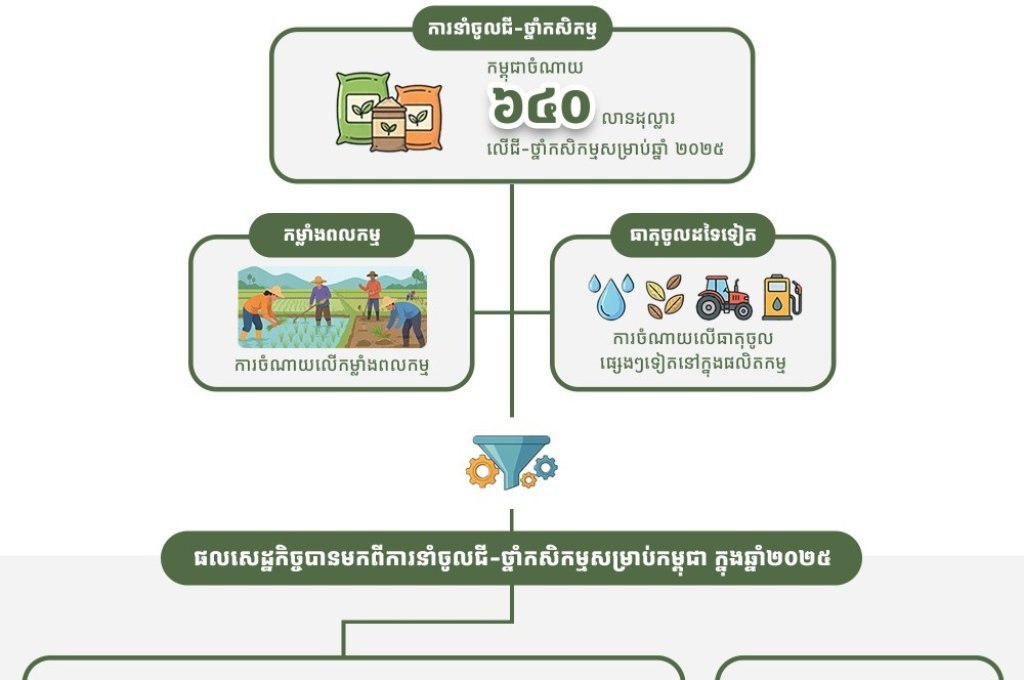 "រូបភាពបង្ហាញខាងក្រោមនេះនឹងជួយពន្យល់ពីភាពចាំបាច់ដែលកម្ពុជាត្រូវការនាំចូលធាតុចូលកសិកម្ម ដើម្បីធានាបាននូវទិន្នផលខ្ពស់ និងការពារដំណាំពីសត្វល្អិតចង្រៃឬជំងឺផ្សេងៗ បន្ថែមពីលើអ្វីដែលយើងមានសមត្ថភាពផលិតបាននៅក្នុងស្រុកដោយខ្លួនឯង"៕