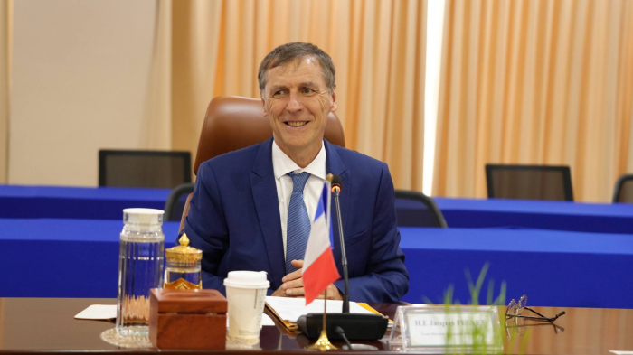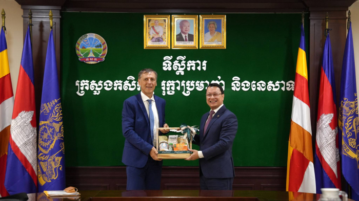 នៅរសៀលថ្ងៃទី២៧ ខែមិថុនា ឆ្នាំ២០២៤ ឯកឧត្តម ឌិត ទីណា រដ្ឋមន្ត្រីក្រសួងកសិកម្ម រុក្ខាប្រមាញ់ និងនេសាទ បានទទួលជួបពិភាក្សាការងារជាមួយ ឯកឧត្តម Jacques PELLET អគ្គរដ្ឋទូតសាធារណរដ្ឋបារាំង ប្រចាំព្រះរាជាណាចក្រកម្ពុជា នៅទីស្តីការក្រសួងកសិកម្ម រុក្ខាប្រមាញ់ និងនេសាទ។