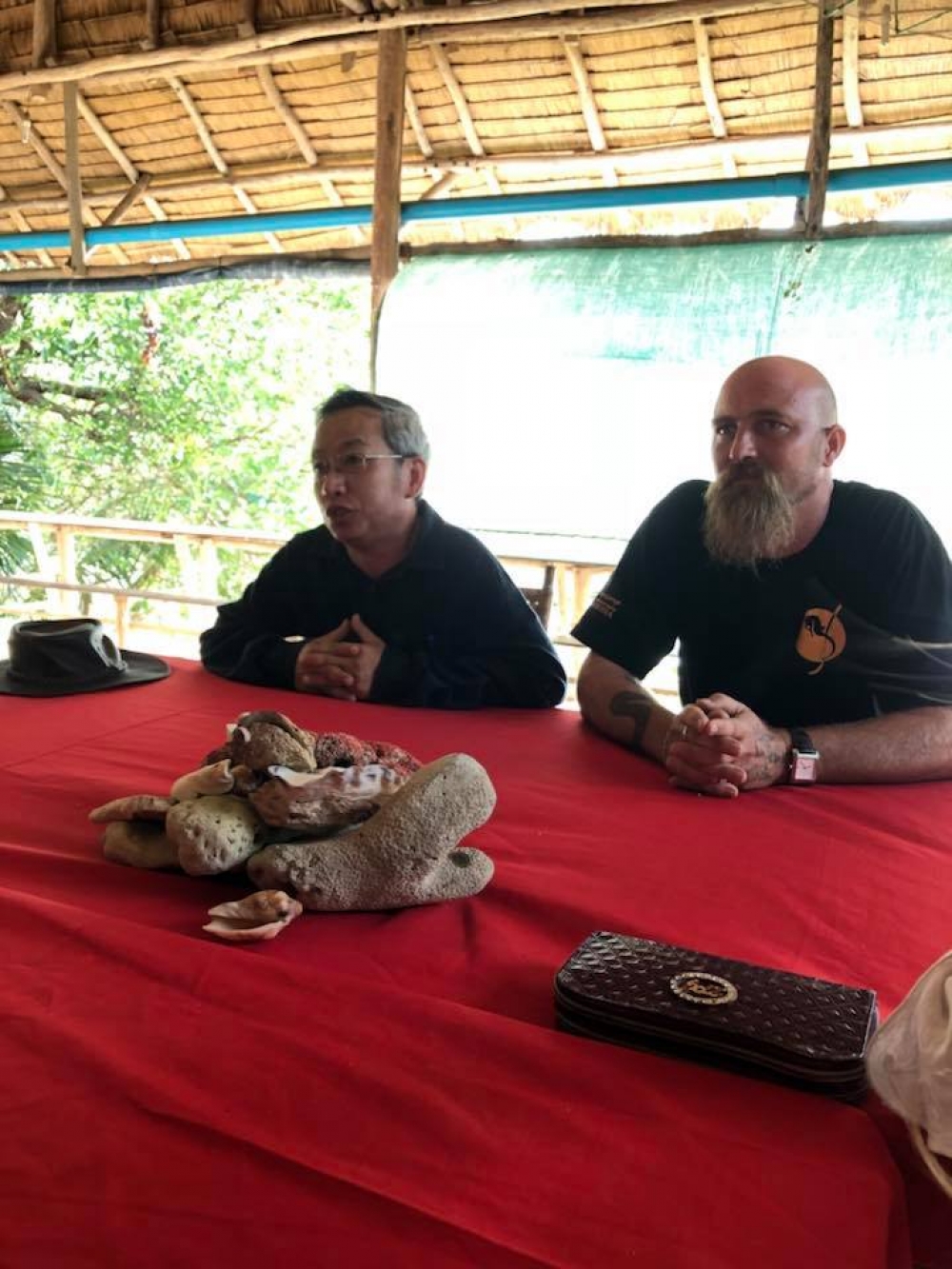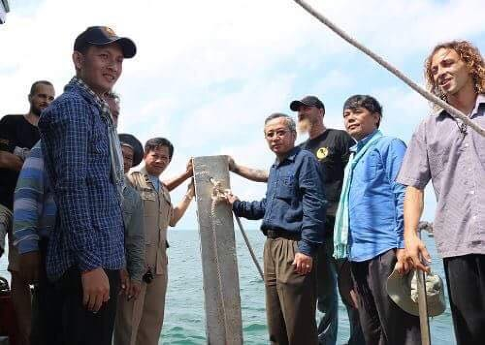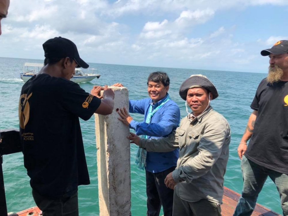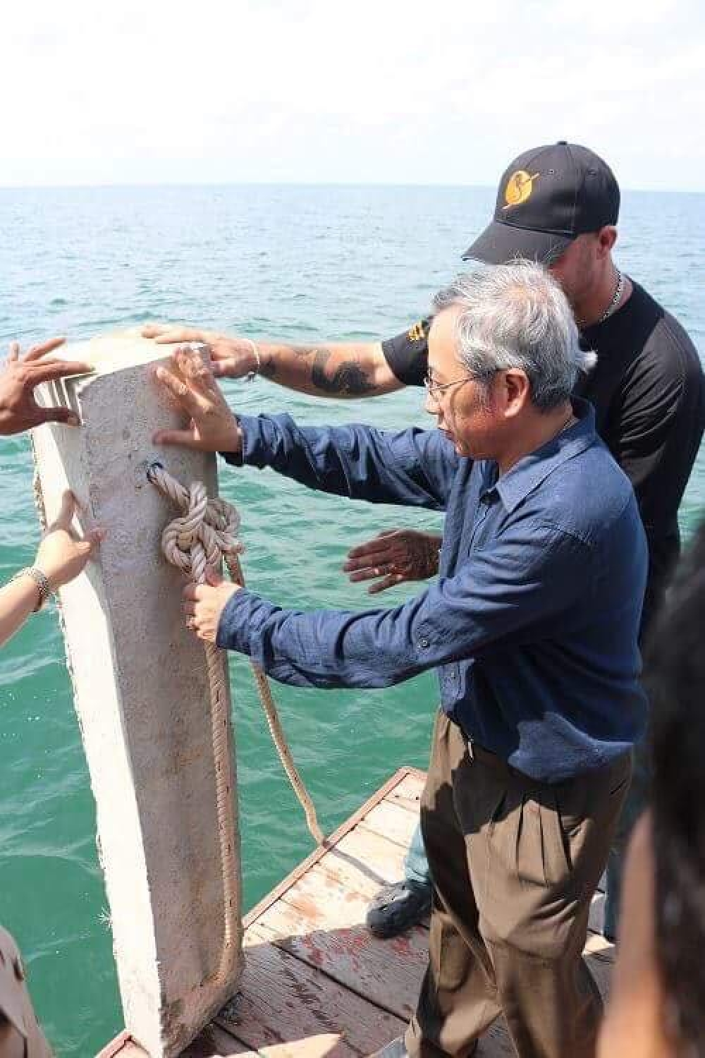 17/03/2018 Accompanied HE Eng Cheasan to visit marine fisheries conservation activities of MCC in KOH Ach Ses, Kep province and deployed concrete boxes for preventing illegal fishing activities and creating spawning ground for fishes.