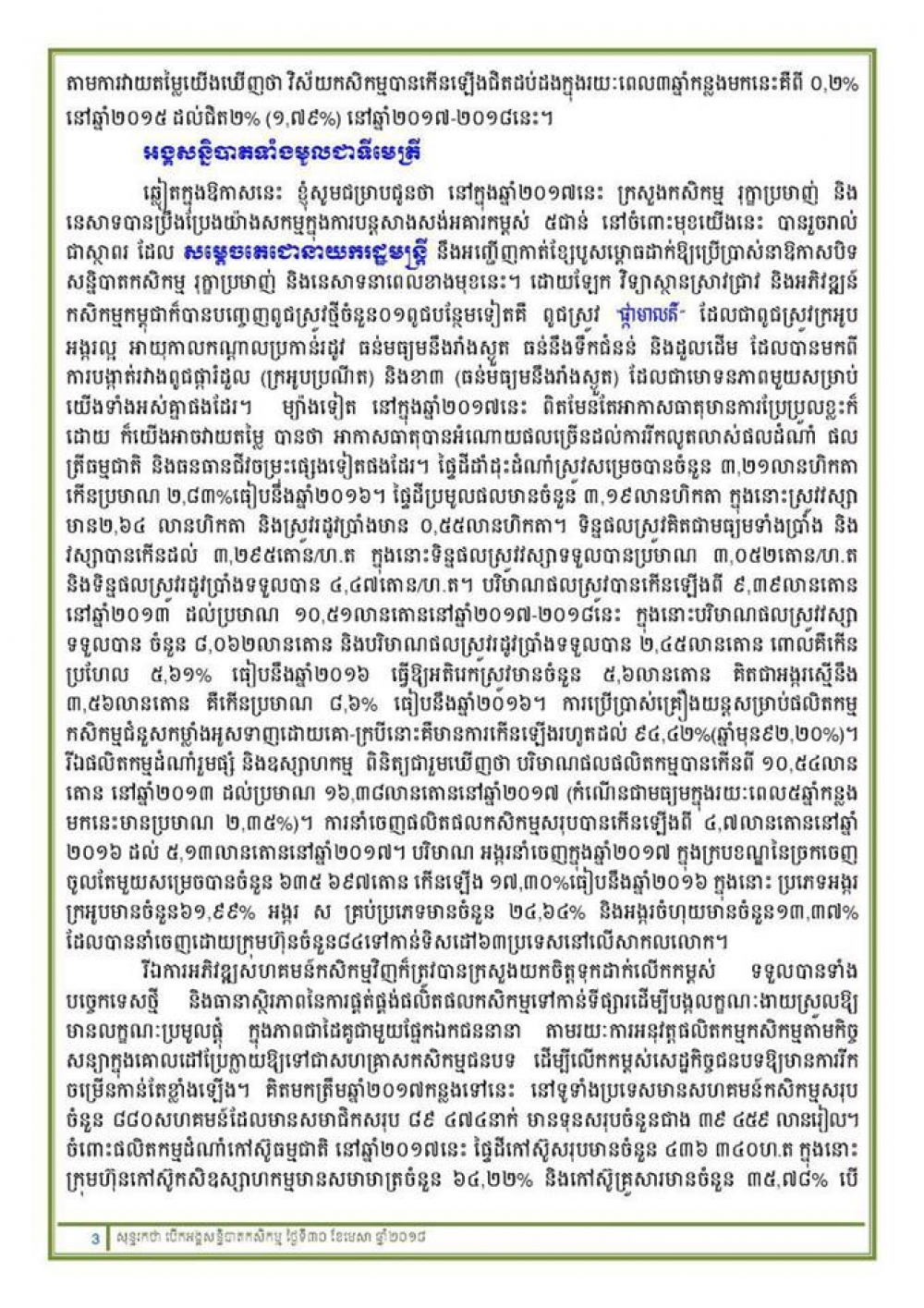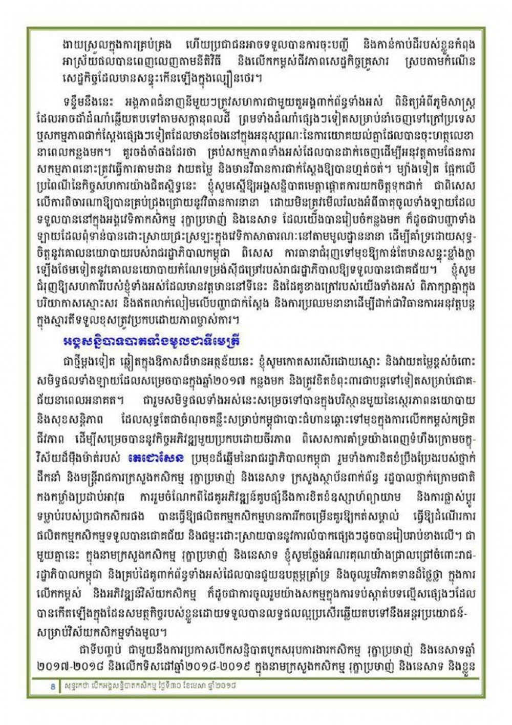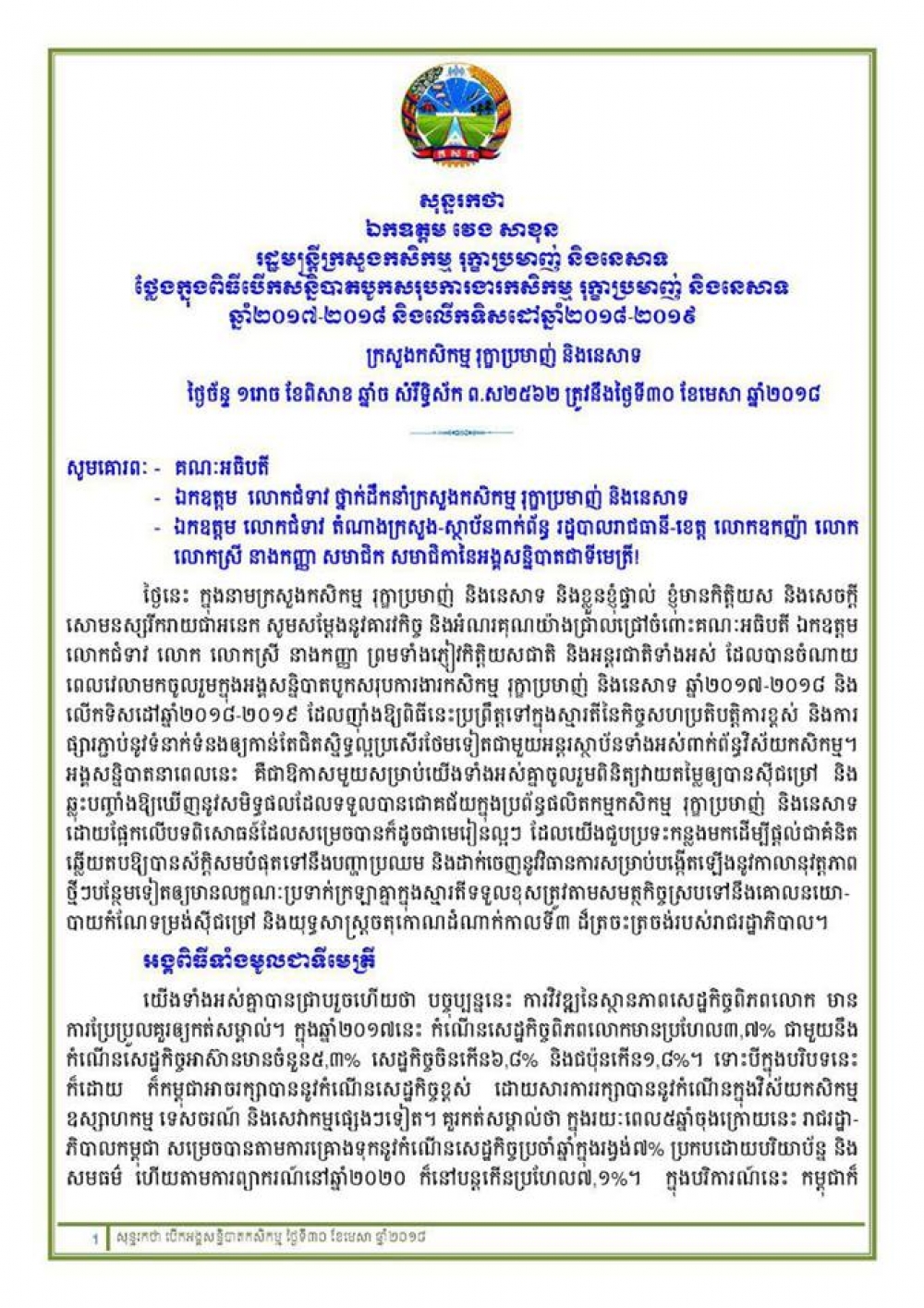 នៅអគារផ្ការំដួល ទីស្តីការក្រសួងកសិកម្ម រុក្ខាប្រមាញ់ និងនេសាទ ព្រឹកថ្ងៃចន្ទ ១រោច ខែពិសាខ ឆ្នាំច សំរឹទ្ធិស័ក ព.ស២៥៦២ ត្រូវនឹងថ្ងៃទី៣០ ខែមេសា ឆ្នាំ២០១៨ បានប្រារព្ធពិធីបើកសន្និបាតបូកសរុបការងារកសិកម្ម រុក្ខាប្រមាញ់និងនេសាទទូទាំងប្រទេសប្រចាំឆ្នាំ២០១៧-២០១៨ និងលើកទិសដៅការងារឆ្នាំ២០១៨-២០១៩ ក្រោមអធិបតីភាព ឯកឧត្តម វេង សាខុន រដ្ឋមន្រ្តីក្រសួងកសិកម្ម រុក្ខាប្រមាញ់ និងនេសាទ ដោយមានការអញ្ជើញចូលរួមពីឯកឧត្តម លោកជំទាវ ថ្នាក់ដឹកនាំក្រសួងកសិកម្មរុក្ខាប្រមាញ់និងនេសាទ តំណាងក្រសួង ស្ថាប័នពាក់ព័ន្ធ និងអាជ្ញាធរថ្នាក់ក្រោមជាតិ ហើយនិងថ្នាក់ដឹកនាំ និងមន្ត្រីរាជការនៃអង្គភាពក្រោមឱវាទនិងមន្ទីរកសិកម្ម រុក្ខាប្រមាញ់រាជធានី-ខេត្ត នៃក្រសួងកសិកម្ម រុក្ខាប្រមាញ់ និងនេសាទ។ (*សូមរកអានសុន្ទរកថាបើកសន្និបាត របស់ឯកឧត្តមរដ្ឋមន្ត្រីក្រសួងកសិកម្ម រុក្ខាប្រមាញ់និងនេសាទ នៅរូបភាពខាងលើ)