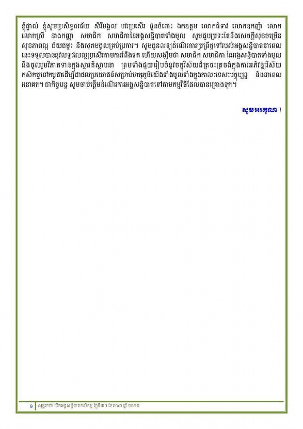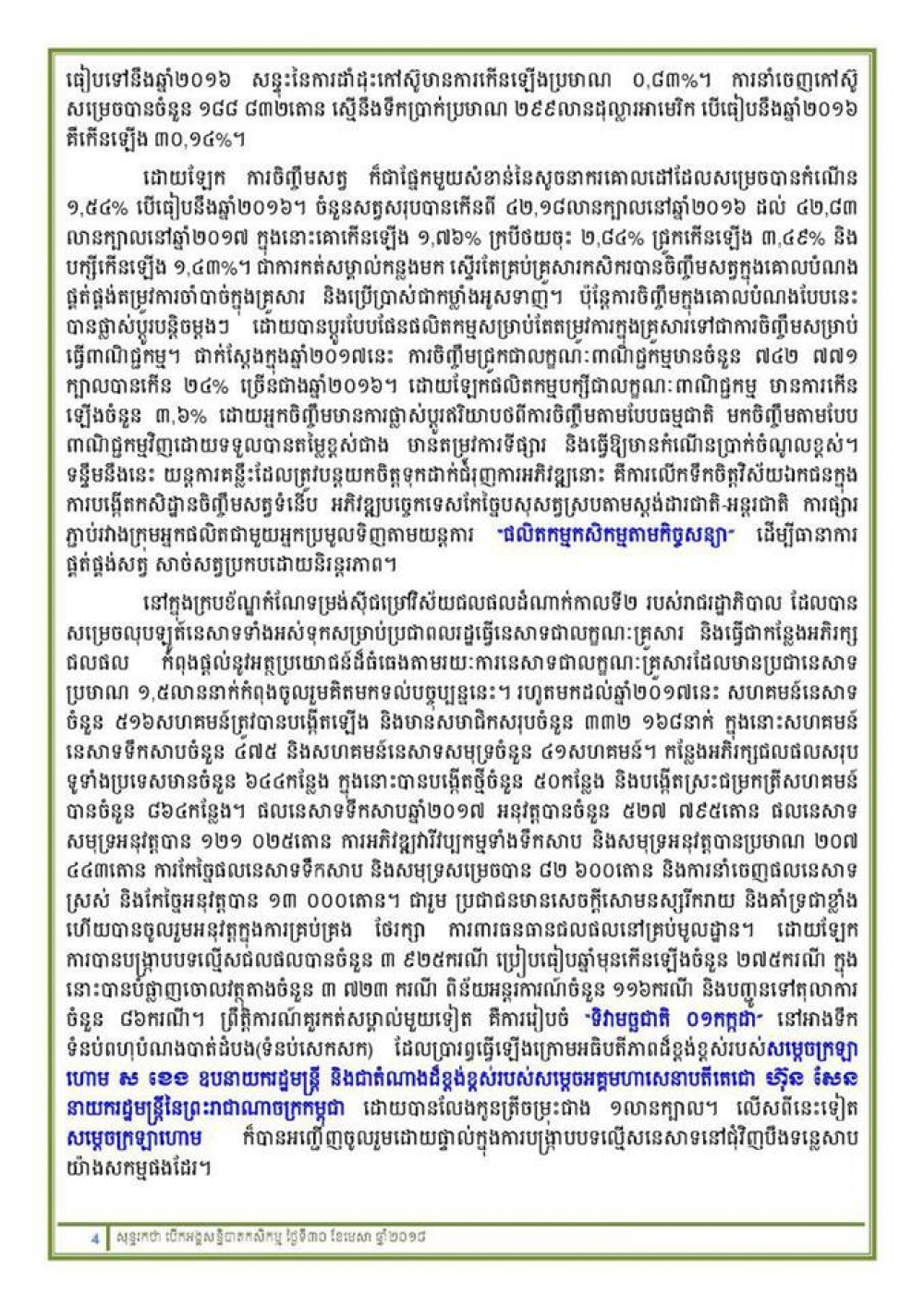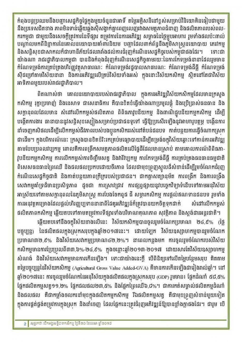 នៅអគារផ្ការំដួល ទីស្តីការក្រសួងកសិកម្ម រុក្ខាប្រមាញ់ និងនេសាទ ព្រឹកថ្ងៃចន្ទ ១រោច ខែពិសាខ ឆ្នាំច សំរឹទ្ធិស័ក ព.ស២៥៦២ ត្រូវនឹងថ្ងៃទី៣០ ខែមេសា ឆ្នាំ២០១៨ បានប្រារព្ធពិធីបើកសន្និបាតបូកសរុបការងារកសិកម្ម រុក្ខាប្រមាញ់និងនេសាទទូទាំងប្រទេសប្រចាំឆ្នាំ២០១៧-២០១៨ និងលើកទិសដៅការងារឆ្នាំ២០១៨-២០១៩ ក្រោមអធិបតីភាព ឯកឧត្តម វេង សាខុន រដ្ឋមន្រ្តីក្រសួងកសិកម្ម រុក្ខាប្រមាញ់ និងនេសាទ ដោយមានការអញ្ជើញចូលរួមពីឯកឧត្តម លោកជំទាវ ថ្នាក់ដឹកនាំក្រសួងកសិកម្មរុក្ខាប្រមាញ់និងនេសាទ តំណាងក្រសួង ស្ថាប័នពាក់ព័ន្ធ និងអាជ្ញាធរថ្នាក់ក្រោមជាតិ ហើយនិងថ្នាក់ដឹកនាំ និងមន្ត្រីរាជការនៃអង្គភាពក្រោមឱវាទនិងមន្ទីរកសិកម្ម រុក្ខាប្រមាញ់រាជធានី-ខេត្ត នៃក្រសួងកសិកម្ម រុក្ខាប្រមាញ់ និងនេសាទ។ (*សូមរកអានសុន្ទរកថាបើកសន្និបាត របស់ឯកឧត្តមរដ្ឋមន្ត្រីក្រសួងកសិកម្ម រុក្ខាប្រមាញ់និងនេសាទ នៅរូបភាពខាងលើ)