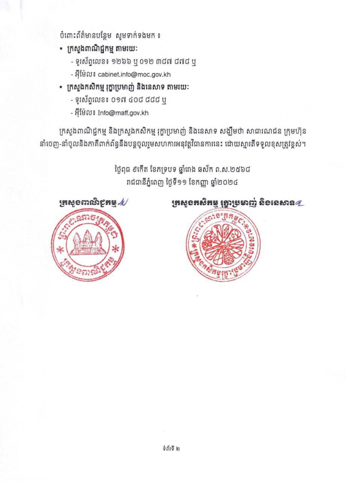 សេចក្តីប្រកាសជូនដំណឹងរួម រវាងក្រសួងពាណិជ្ជកម្ម និងក្រសួងកសិកម្ម រុក្ខាប្រមាញ់ និងនេសាទ អំពីការកែសម្រួលវិធានការហាមឃាត់ការនាំចូលជាបណ្តោះអាសន្ន នូវគ្រឿងក្នុង និងបំណែកសាច់បង្កក