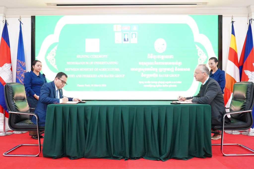 នាព្រឹកថ្ងៃទី៣០ ខែមីនា ឆ្នាំ២០២៦ ឯកឧត្តមអគ្គលេខាធិការ សរ ចិត្រា តំណាងដ៏ខ្ពង់ខ្ពស់ ឯកឧត្តម ឌិត ទីណា រដ្ឋមន្ត្រីក្រសួងកសិកម្ម រុក្ខាប្រមាញ់ និងនេសាទ បានអញ្ជើញចូលរួមក្នុងពិធីចុះហត្ថលេខាលើអនុស្សរណៈនៃការយោគយល់គ្នា(MoU) រវាងក្រសួងកសិកម្ម រុក្ខាប្រមាញ់ និងនេសាទ ជាមួយក្រុមហ៊ុន BAUER Group ស្តីពីការធ្វើការសិក្សាសមិទ្ធិលទ្ធភាពសម្រាប់គម្រោងអភិវឌ្ឍន៍ផលិតកម្មដំណាំចំណីសត្វលើផ្ទៃដីកសិកម្មប្រមាណ ៦០០ ហិកតា ដែលមានទីតាំងនៅខេត្តកំពង់ឆ្នាំង។