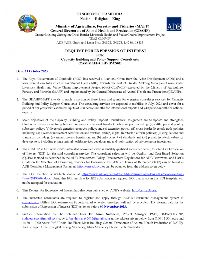 សេចក្តីជូនដំណឹង ស្តីពីការជ្រើសរើសក្រុមទីប្រឹក្សាសម្រាប់កសាងសមត្ថភាពនិងគាំទ្រគោលនយោបាយ Capacity Building and Policy Support Consultants (CAM-MAFF-CLHVIP-CS02)