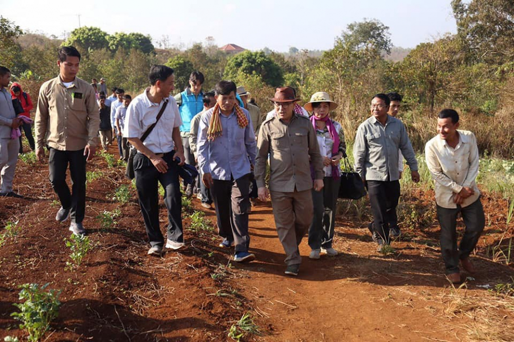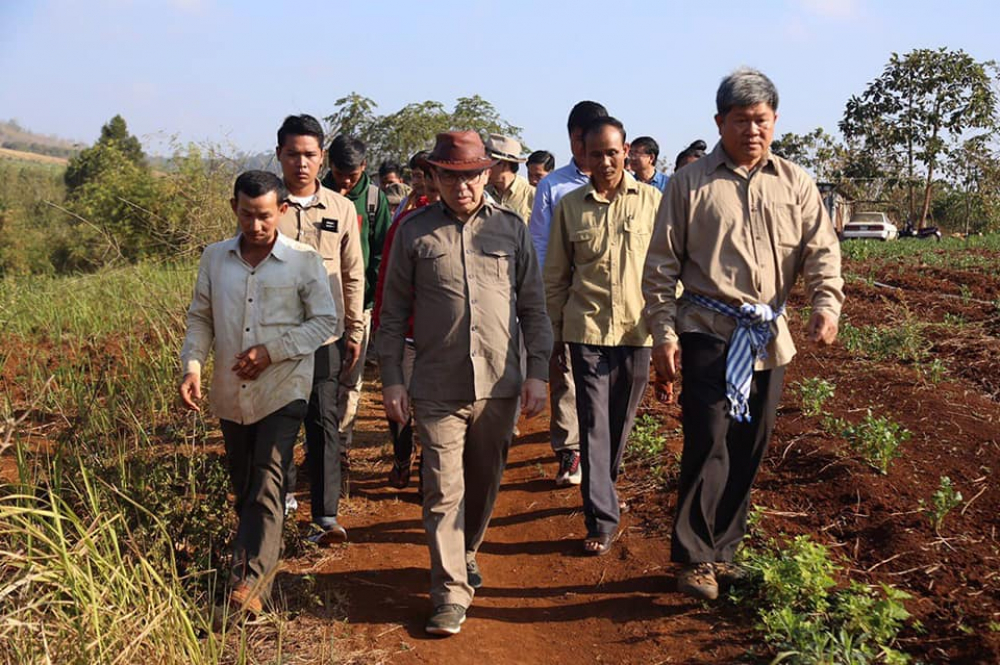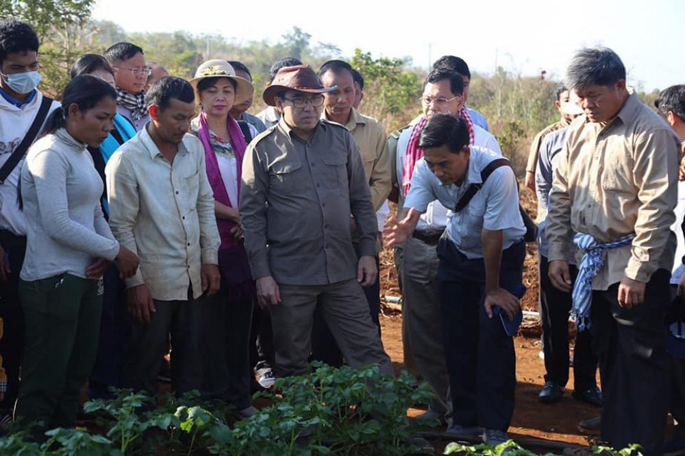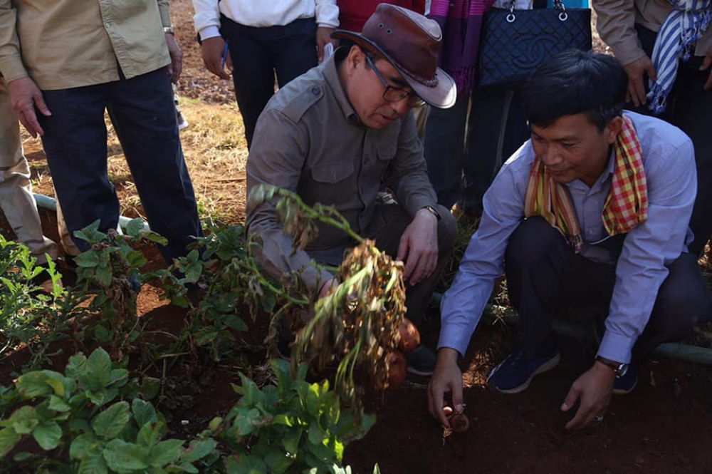 មណ្ឌលគិរី៖ នាព្រឹកថ្ងៃសៅរ៍ ៥កើត ខែមាឃ ឆ្នាំច សំរឹទ្ធិស័ក ព.ស ២៥៦២ ត្រូវនឹងថ្ងៃទី០៩ ខែកុម្ភៈ ឆ្នាំ ២០១៩ ឯកឧត្តម វេង សាខុន រដ្ឋមន្រ្តីក្រសួងកសិកម្ម រុក្ខាប្រមាញ់ និងនេសាទ និងលោកជំទាវ អមដំណើរដោយឯកឧត្តមជាថ្នាក់ដឹកនាំក្រសួង ព្រមទាំងមន្រ្តីរាជការក្រោមឱវាទក្រសួង ឯកឧត្តម ស្វាយ សំអ៊ាង អភិបាលនៃគណៈអភិបាលខេត្តមណ្ឌលគិរី និងលោកប្រធានមន្ទីរកសិកម្មខេត្តមណ្ឌលគិរី បានអញ្ជើញចុះពិនិត្យសភាពការណ៍បង្កបង្កើនផលកសិកម្ម និងការប្រមូលផលដំណាំដំឡូងបារាំង របស់កសិករ គ្រី ម៉េងឃាង ស្ថិតនៅភូមិចំការតែ សង្កាត់ស្ពានមានជ័យ ក្រុងសែនមនោរម្យ ខេត្តមណ្ឌលគិរី។