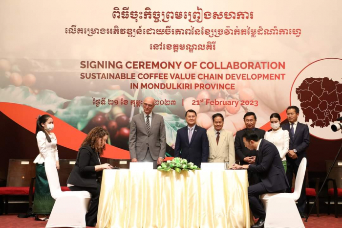 នាព្រឹកថ្ងៃទី២១ ខែកុម្ភៈ ឆ្នាំ២០២៣ ឯកឧត្តម ឌិត ទីណា រដ្ឋមន្ត្រី ក្រសួងកសិកម្ម រុក្ខាប្រមាញ់ និងនេសាទ និងថ្នាក់ដឹកនាំ បានអញ្ជើញចូលរួមជាអធិបតីពិធីចុះកិច្ចព្រមព្រៀងផ្តល់ហិរញ្ញប្បទានអភិវឌ្ឍន៍គម្រោងខ្សែច្រវាក់តម្លៃដំណាំកាហ្វេនៅខេត្តមណ្ឌលគិរី នៅសណ្ឋាគារ សូហ្វីតែលភ្នំពេញ។