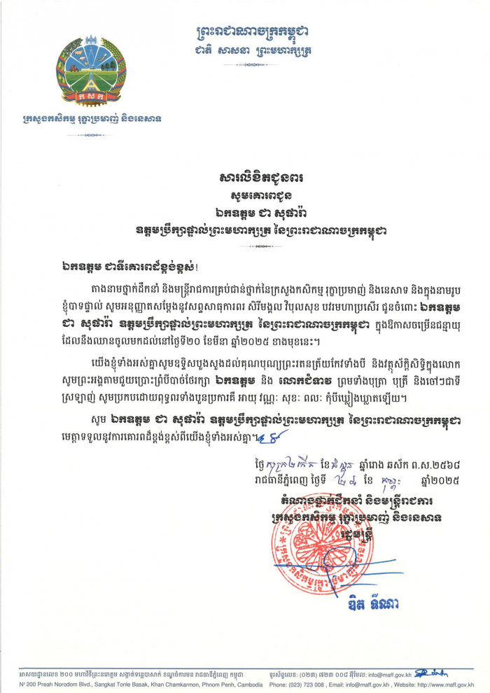 សារលិខិតជូនពរ ពីឯកឧត្តម ឌិត ទីណា រដ្ឋមន្រ្តីក្រសួងកសិកម្ម រុក្ខាប្រមាញ់ និងនេសាទ ផ្ញើជូន ឯកឧត្តម ជា សុផារ៉ា ឧត្តមប្រឹក្សាផ្ទាល់ព្រះមហាក្សត្រ នៃព្រះរាជាណាចក្រកម្ពុជា ក្នុងឱកាសចម្រើនជន្មាយុ៕