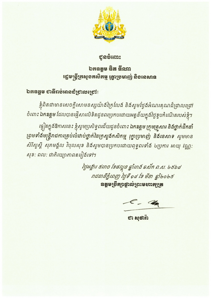 សារលិខិតជូនពរ ពីឯកឧត្តម ឌិត ទីណា រដ្ឋមន្រ្តីក្រសួងកសិកម្ម រុក្ខាប្រមាញ់ និងនេសាទ ផ្ញើជូន ឯកឧត្តម ជា សុផារ៉ា ឧត្តមប្រឹក្សាផ្ទាល់ព្រះមហាក្សត្រ នៃព្រះរាជាណាចក្រកម្ពុជា ក្នុងឱកាសចម្រើនជន្មាយុ