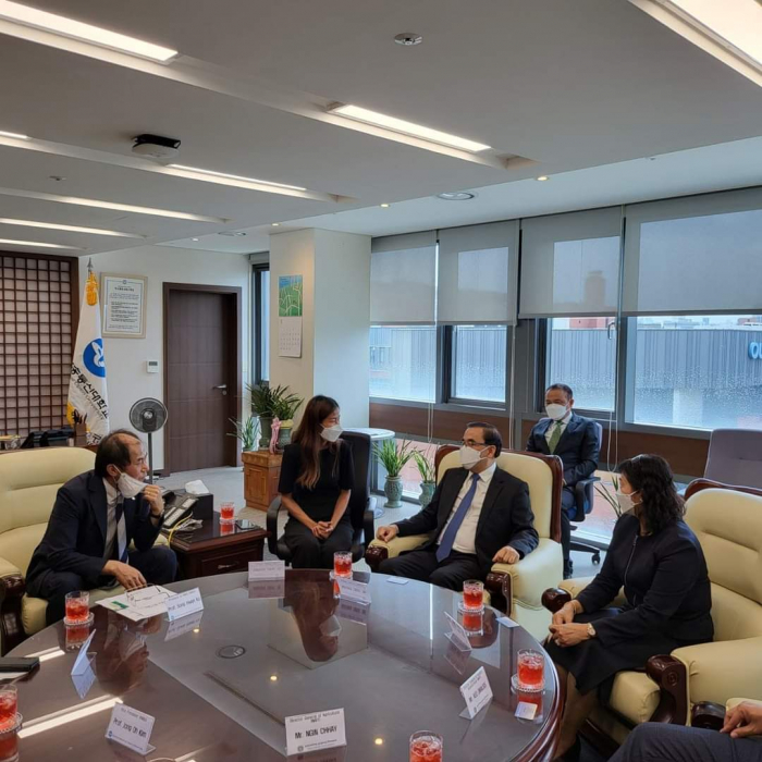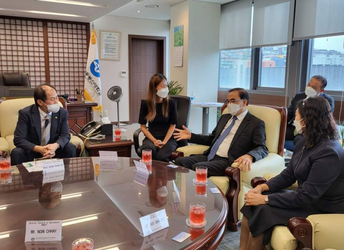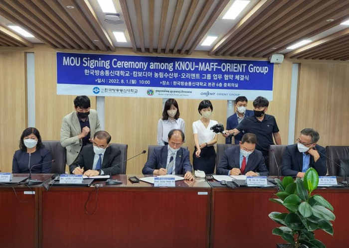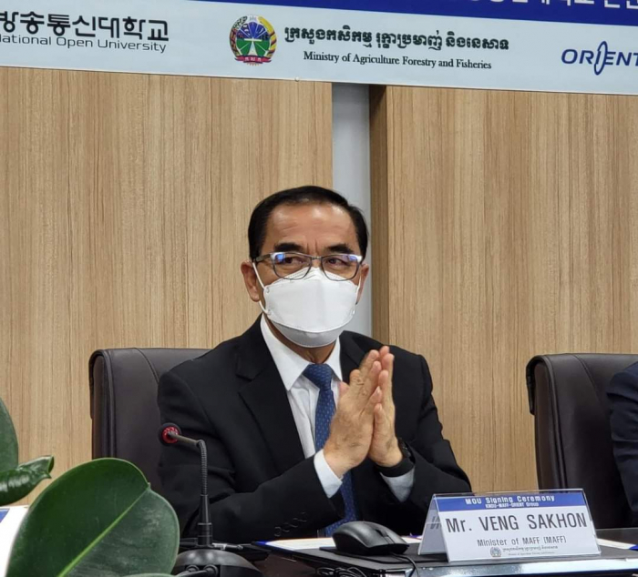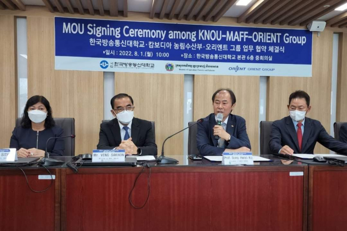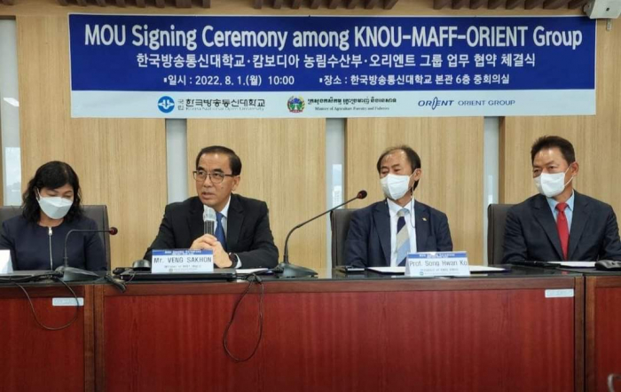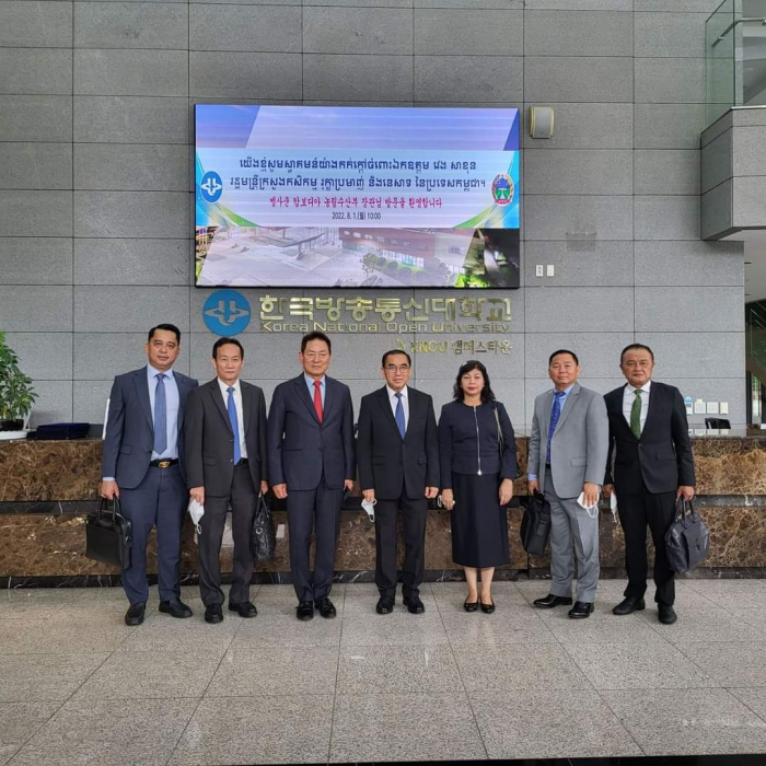 នៅវេលាម៉ោង ១០ ព្រឹកថ្ងៃចន្ទ ៤កើត ខែស្រាពណ៍ ឆ្នាំខាល ព.ស ២៥៦៦ ត្រូវនឹង ថ្ងៃទី០១ ខែសីហា ឆ្នាំ២០២២ ឯកឧត្តមរដ្ឋមន្ត្រី វេង សាខុន និងសហការីបាន អញ្ជើញមកធ្វើទស្សនកិច្ចនៅសាកលវិទ្យាល័យ Korea National Open University ក្នុងបំណងធ្វើការពិភាក្សាឲ្យកាន់តែស៊ីជម្រៅ និងទូលំទូលាយជាមួយ សាស្រ្តាចារ្យសាកលវិទ្យាធិការ Dr. Songhwan KO លើប្រធានបទស្តីពី "ការអភិវឌ្ឍធនធានមនុស្សតាមរយ:ការបណ្តុះបណ្តាលជំនាញវិស័យកសិកម្មដល់មន្រ្តី និស្សិត លោកគ្រូ អ្នកគ្រូ និងកសិករឆ្នើម" ដើម្បីបង្កើនចំណេះដឹង និងបទពិសោធន៍ក្នុងការ អនុវត្តជាក់ស្តែង" និងចុះហត្ថលេខាលើអនុស្សរណ:នៃការយោគយល់គ្នា (MOU) ត្រីភាគីរវាងក្រសួងកសិកម្ម រុក្ខាប្រមាញ់ និងនេសាទ សាកលវិទ្យាល័យ Korea National Open University និងក្រុមហ៊ុន Orient Group ។ មានប្រសាសន៍ទៅកាន់សាកលវិទ្យាធិការ ឯកឧត្តមរដ្ឋមន្រ្តី បានថ្លែងអំណរគុណយ៉ាងជ្រាលជ្រៅជូនចំពោះប្រជាជន និងរដ្ឋាភិបាលកូរ៉េដែលបានជួយអភិវឌ្ឍប្រទេសកម្ពុជា រួមទាំងវិស័យកសិកម្មផងដែរ។ ជាក់ស្តែង គណ:ប្រតិភូក្រសួងកសិកម្ម រុក្ខាប្រមាញ់ និងនេសាទ បានអញ្ជើញមកធ្វើទស្សនកិច្ចនៅសាកលវិទ្យាល័យនាថ្ងៃនេះ ក្នុងបំណងបង្កើតកិច្ចសហប្រតិបត្តការស្តីពី "ការបណ្តុះបណ្តាលធនធានមនុស្សលើវិស័យកសិកម្ម"។ ឆ្លៀតយកឱកាសនេះ ឯកឧត្តមរដ្ឋមន្រ្តីបានជម្រាបជូនសាកលវិទ្យាធិការដោយសង្ខេបអំពីសាវតានៃការអភិវឌ្ឍប្រទេសដោយចាប់ផ្តើមពីចំណុចសូន្យ ជាបន្ត បន្ទាប់ និងពីដំណាក់កាលមួយមកដំណាក់កាលមួយ កម្ពុជាបានដើរចេញពីប្រទេសក្រីក្រ អសន្តិសុខស្បៀង មកជាប្រទេសមានសន្តិភាព និងការអភិវឌ្ឍ ប្រទេសមានអធិរេកស្បៀង និងនាំចេញកសិផល ក្រោមការដឹកនាំប្រកបដោយគតិបណ្ឌិតសម្តេចតេជោ ហ៊ុន សែន នាយករដ្ឋមន្រ្តី។ បច្ចុប្បន្នកម្ពុជាជាប្រទេសផលិតស្បៀង មិនត្រឹមតែសម្រាប់ផ្គត់ផ្គង់បានគ្រប់គ្រាន់តាមតម្រូវការក្នុងស្រុក និងធានាបាននូវសន្តិសុខស្បៀងប៉ុណ្ណោះទេ ប៉ុន្តែជាប្រទេសផលិតស្បៀងសម្រាប់ផ្គត់ផ្គង់ឲ្យទីផ្សារអន្តរជាតិមាន: ស្រូវ អង្ករ ដំឡូងមី ចេក ស្វាយ ស្វាយ ចន្ទី និងកៅស៊ូ។ល។ ដើម្បីឲ្យផលិតកម្មកសិកម្មកម្ពុជាកាន់តែមានសក្តានុពល លទ្ធភាព សមត្ថភាព និងការប្រកួតប្រជែងទីផ្សារនាំចេញដែលមាននិន្នាការកាន់តែកើនឡើងខ្ពស់។ ហេតុនេះ ក្រសួងកសិកម្ម រុក្ខាប្រមាញ់ និងនេសាទ បានខិតខំចាប់យកវិស័យឯកជន ដៃគូអភិវឌ្ឍ និងសហគមន៍កសិកម្ម ធ្វើជាដៃគូរយ:ពេលវែងសម្រាប់ការអភិវឌ្ឍវិស័យកសិកម្ម។ ជាក់ស្តែង ដំណើរទស្សន:កិច្ចនៅកូរ៉េនាពេលនេះ និងជា ពិសេសទស្សនកិច្ចនៅសាកលវិទ្យាល័យ Korea National Open University ព្រឹកនេះ គឺមានបំណងបង្កើតកិច្ចសហប្រតិបត្តការលើការបណ្តុះបណ្តាលធនធាន មនុស្សលើវិស័យកសិកម្ម ដើម្បីបង្កើនសមត្ថភាពផលិត បង្កើនផលិតភា