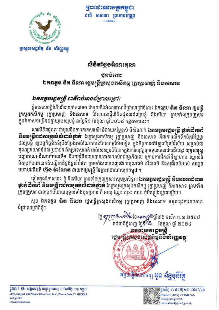 សារលិខិតជូនពរ ពីឯកឧត្តម ឌិត ទីណា រដ្ឋមន្រ្តីក្រសួងកសិកម្ម រុក្ខាប្រមាញ់ និងនេសាទ ផ្ញើជូន ឯកឧត្តមអគ្គបណ្ឌិតសភាចារ្យ អូន ព័ន្ធមុនីរ័ត្ន ឧបនាយករដ្ឋមន្ត្រី រដ្ឋមន្ត្រីក្រសួងសេដ្ឋកិច្ច និងហិរញ្ញវត្ថុ ក្នុងឱកាសចម្រើនជន្មាយុគម្រប់៥៩ ឆ្នាំ ឈានចូល៦០ឆ្នាំ