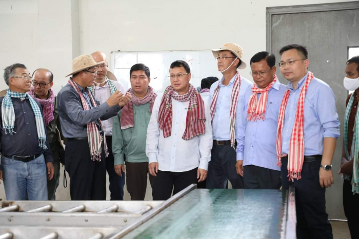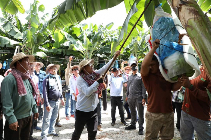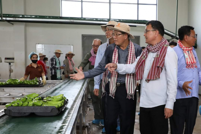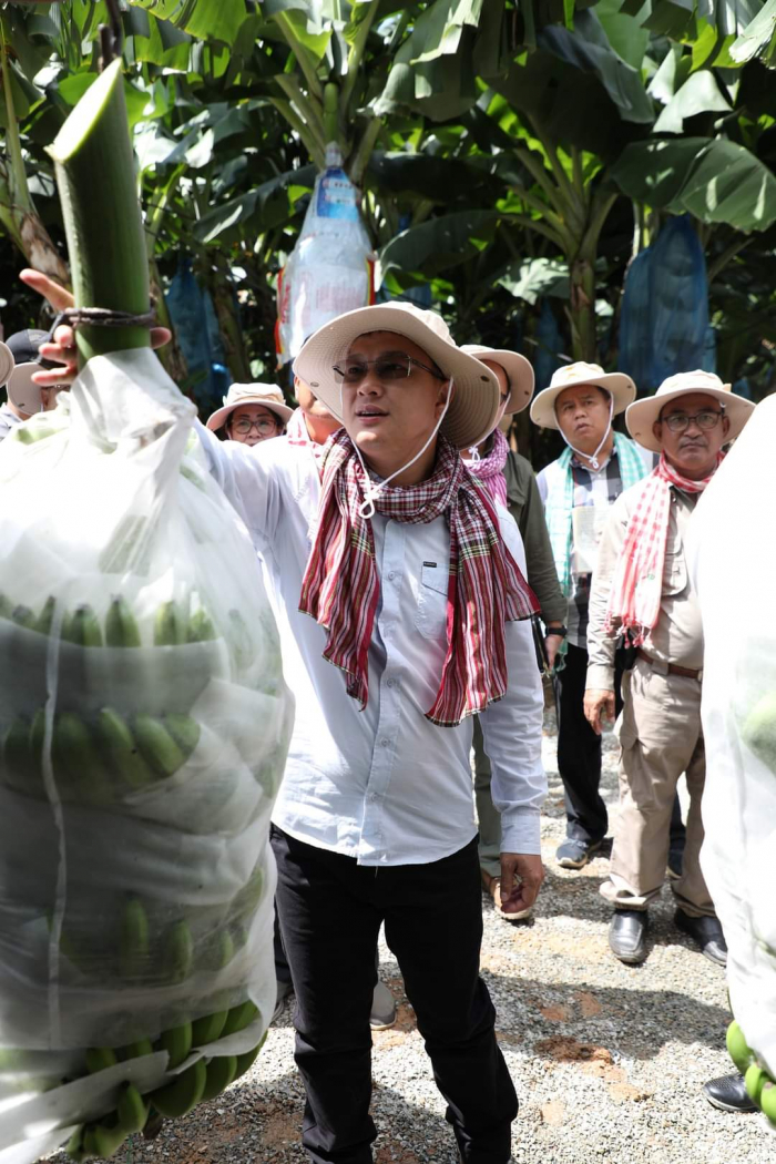 កម្មវិធីទី២៖២៣-វិច្ឆិកា ឆ្នាំ២០២២ (ស្រុកឈូក ខេត្តកំពត)៖ ឯកឧត្តមរដ្ឋមន្ត្រីក្រសួងកសិកម្ម រុក្ខាប្រមាញ់ និងនេសាទ និងសហការីអមដំណើរ ចុះពិនិត្យផលិតកម្មចេកអំបូងលឿង របស់ក្រុមហ៊ុន Long Mate នៅស្រុកឈូក ខេត្តកំពត --------------------------------------------- នាព្រឹកថ្ងៃទី២៣ ខែវិច្ឆិកា ឆ្នាំ២០២២ ដដែលនេះ ឯកឧត្តម ឌិត ទីណា រដ្ឋមន្ត្រីក្រសួងកសិកម្ម រុក្ខាប្រមាញ់ និងនេសាទ និងសហការីអមដំណើរ បានបន្តដំណើរចុះពិនិត្យផលិតកម្មចេកអំបូងលឿង របស់ក្រុមហ៊ុន ឡងមេត(Long Mate Agriculture Co.,Ltd) ដែលមានទីតាំងនៅស្រុកឈូក ខេត្តកំពត ។ ឯកឧត្តមបានធ្វើការកោតសរសើរ និងវាយតម្លៃខ្ពស់ចំពោះការចូលរួមគាំទ្រការវិនិយោគលើវិស័យកសិកម្មនៅកម្ពុជា។ យ៉ាងណាមិញ ក្នុងដំណើរការនៃផលិតកម្មដំណាំចេកនេះ ឯកឧត្តមរដ្ឋមន្ត្រី បានពិនិត្យឃើញថា ក្រុមហ៊ុនបានផ្តល់ការងារនៅនឹងកន្លែដល់ប្រជាជន កាត់បន្ថយការធ្វើចំណាកស្រុក បង្កើនប្រាក់ចំណូល និងជួយឱ្យមានកំណើនសេដ្ឋកិច្ចជាតិ ។ ក្នុងគោលបំណងពង្រឹងកិច្ចសហការរវាងរដ្ឋ និងវិស័យឯកជន ក្រសួងបានគាំទ្រ និងនៅតែបន្តការផ្តល់សេវាបច្ចេកទេស និងសម្របសម្រួលឱ្យមានស្តង់ដារក្នុងការនាំចេញកសិផលកម្ពុជាលើទីផ្សារអន្តរជាតិ ។ ទៅថ្ងៃអនាគត ឯកឧត្តមរដ្ឋមន្ត្រី ឌិត ទីណា ផ្តល់ការលើកទឹកចិត្តដល់វិស័យឯកជនបន្តពង្រីកការវិនិយោគលើដំណាំអទិភាពផ្សេងទៀត នៅកម្ពុជា៕