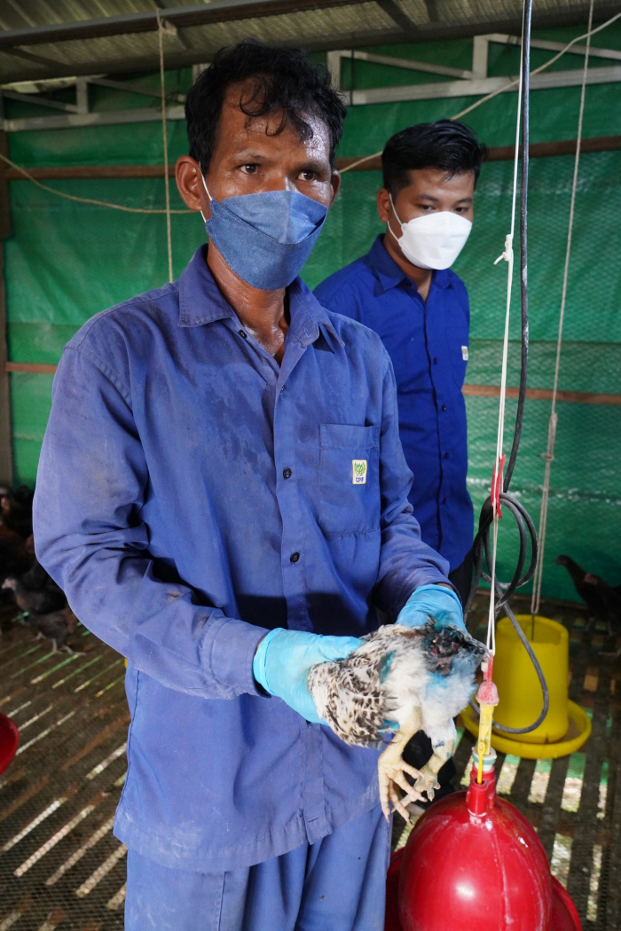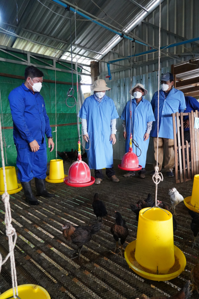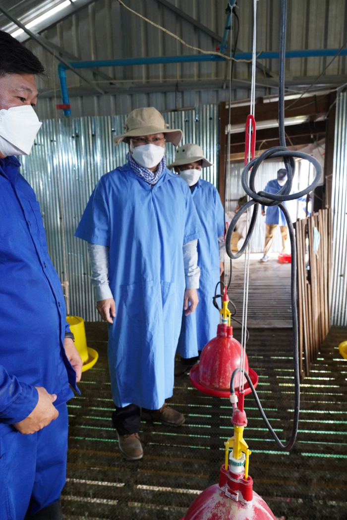 បន្ទាប់ពីបានចុះពិនិត្យបន្លែក្នុងផ្ទះសំណាញ់ ឯកឧត្តមរដ្ឋមន្ត្រី បានបន្តពិនិត្យបណ្តុំអាជីវកម្មចិញ្ចឹមមាន់ជាលក្ខណៈគ្រួសារ ដោយបានណែនាំកសិករឱ្យសិក្សាពីបច្ចេកទេសច្បាស់លាស់នៃការចិញ្ចឹម ស្វែងយល់ពីខ្សែច្រវាក់នៃការផ្គត់ផ្គង់និងតម្លៃទីផ្សារ និងប្រសិទ្ធភាពសេដ្ឋកិច្ច។