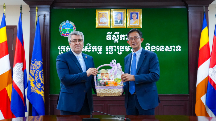 នៅរសៀលថ្ងៃទី០២ ខែឧសភា ឆ្នាំ២០២៥ ឯកឧត្តម អុឹម​ ស៊ីថុល​ រដ្ឋលេខាធិការប្រចាំការក្រសួងកសិកម្ម រុក្ខាប្រមាញ់ និងនេសាទ និងថ្នាក់ដឹកនាំ បានទទួលជួបជាមួយឯកឧត្តម អាលី អាកបារ ណាហ្សារី (Ali Akbar Nazari) ឯកអគ្គរដ្ឋទូតនៃសាធារណរដ្ឋឥស្លាមអ៊ីរ៉ង់ប្រចាំនៅកម្ពុជា ដែលមាននិវេសនដ្ឋាននៅទីក្រុងហាណូយ​ ក្នុងជំនួបសម្ដែងការគួរសម​ និងពិភាក្សាការងារ នៅទីស្តីការក្រសួងកសិកម្ម រុក្ខាប្រមាញ់ និងនេសាទ។