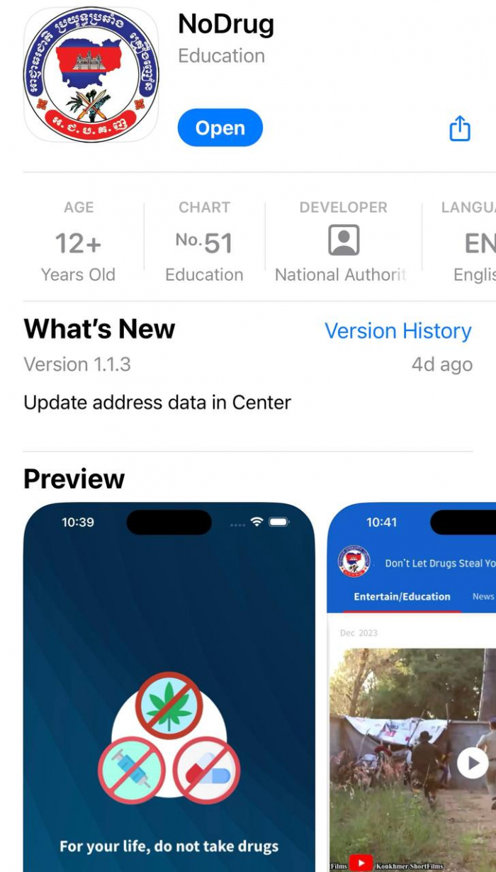 កម្មវិធីទូរស័ព្ទដៃ «កុំប្រេីប្រាស់គ្រឿងញៀន» (NoDrug) មានផ្តល់ព័ត៌មានអប់រំប្រឆាំងការប្រេីប្រាស់គ្រឿងញៀន ព័ត៌មានទាន់ហេតុការណ៍ ព័ត៌មានផលប៉ះពាល់ដោយសារការប្រេីប្រាស់គ្រឿងញៀន និងព័ត៌មានអំពីមជ្ឈមណ្ឌលស្តារនីតិសម្បទាអ្នកញៀនគ្រឿងញៀន ព្រមទាំងផ្តល់លទ្ធភាពឱ្យសាធារណ:ជនរាយការណ៍អំពីករណីប្រេីប្រាស់ និងចរាចរណ៍គ្រឿងញៀន ដល់អាជ្ញាធរដេីម្បីមានវិធានការភ្លាមៗ៕