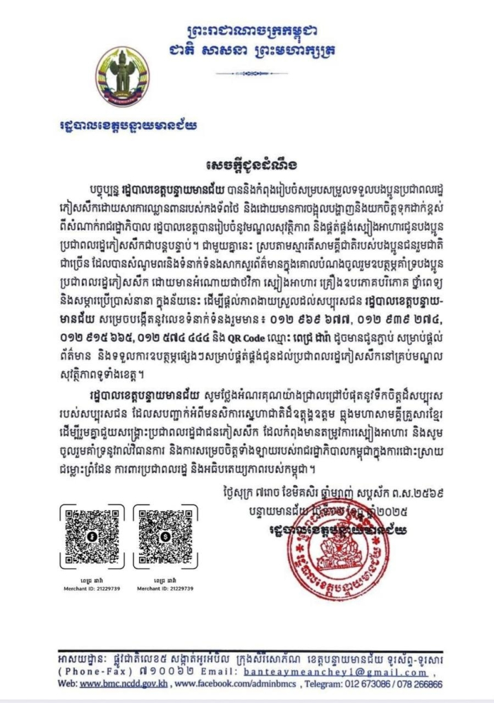 ដោយទទួលបាននូវសំណូមពរពីសំណាក់សប្បុរសជនជាច្រើន រដ្ឋបាលខេត្តបន្ទាយមានជ័យបានសម្រេចបង្កើតលេខទំនាក់ទំនង ០១២ ៩៦៩ ៦៧៧, ០១២ ៩៣៩ ២៧៤, ០១២ ៩១៥ ៦៦៥, ០១២ ៥៧៤ ៤៤៤ និង QR Code ឈ្មោះ ពេជ្រ ដារ៉ា ដើម្បីសម្របសម្រួលដល់សប្បុរសជនក្នុងការទទួលព័ត៌មាន និងធ្វើការឧបត្ថម្ភផ្សេងៗសម្រាប់ផ្គត់ផ្គង់ជូនប្រជាពលរដ្ឋភៀសសឹកនៅគ្រប់មណ្ឌលសុវត្ថិភាពទូទាំងខេត្ត៕