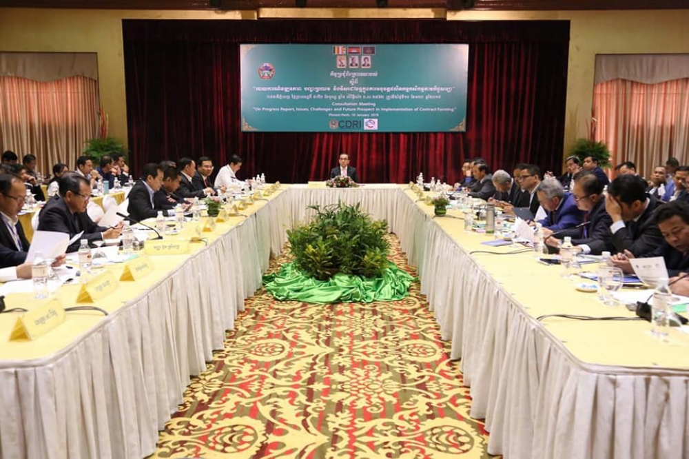 នៅសណ្ឋាគារភ្នំពេញ នាព្រឹកថ្ងៃព្រហស្បតិ៍ ៥កើត ខែបុស្ស ឆ្នាំច សំរឹទ្ធិស័ក ព.ស២៥៦២ ត្រូវនឹងថ្ងៃទី១០ ខែមករា ឆ្នាំ២០១៩ នាយកដ្ឋានកសិ-ឧស្សាហកម្ម សហការជាមួយវិទ្យាស្ថានបណ្តុះបណ្តាល និងស្រាវជ្រាវដើម្បីអភិវឌ្ឍន៍កម្ពុជា (Cambodia Development and Resource Institute, CDRI) បានរៀបចំកិច្ចប្រជុំដើម្បីពិនិត្យ និងពិភាក្សាលើប្រធានបទស្តីពី “របាយការណ៍វឌ្ឍនភាព បញ្ហាប្រឈម និងទិសដៅបន្តក្នុងការអនុវត្តផលិតកម្មកសិកម្មតាមកិច្ចសន្យា” ក្រោមអធិបតីភាព ឯកឧត្តម វេង សាខុន រដ្ឋមន្រ្តីក្រសួងកសិកម្ម រុក្ខាប្រមាញ់ និងនេសាទ អមដោយឯកឧត្តម លោកជំទាវជាថ្នាក់ដឹកនាំក្រសួង ថ្នាក់ដឹកនាំអញ្ជើញមកពីអន្តរក្រសួងពាក់ព័ន្ធ លោកឧកញ៉ា លោក លោកស្រី សមាជិក សមាជិកានៃគណៈកម្មាធិការសម្របសម្រួលកិច្ចសន្យាផលិតកម្មកសិកម្ម ភ្ញៀវកិត្តិយសជាតិ-អន្តរជាតិ និងដៃគូអភិវឌ្ឍន៍យ៉ាងច្រើនកុះករ។