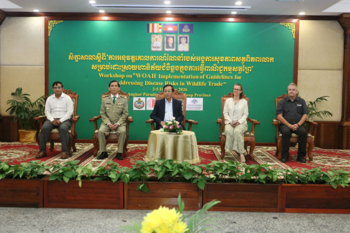 នាថ្ងៃទី៥ ខែកុម្ភៈ ឆ្នាំ២០២៦ ឯកឧត្ដម សេន សុវណ្ណ រដ្ឋលេខាធិការក្រសួងកសិកម្ម រុក្ខាប្រមាញ់ និងនេសាទ និងជាប្រធានគណៈកម្មការបច្ចេកទេសសុខភាពតែមួយ បានអញ្ជើញជាអធិបតីភាពក្នុងពិធីបិទសិក្ខាសាលាស្ដីពី «ការអនុវត្តគោលការណ៍ណែនាំសម្រាប់ដោះស្រាយហានិភ័យជំងឺឆ្លងក្នុងការធ្វើពាណិជ្ជកម្មសត្វព្រៃ» នៅខេត្តសៀមរាប។