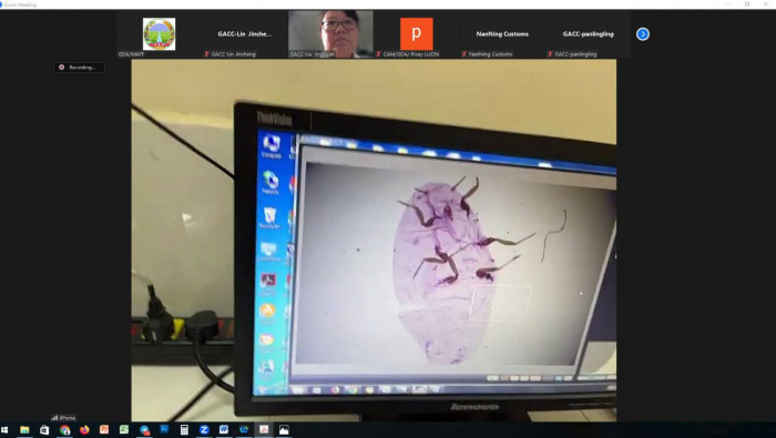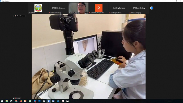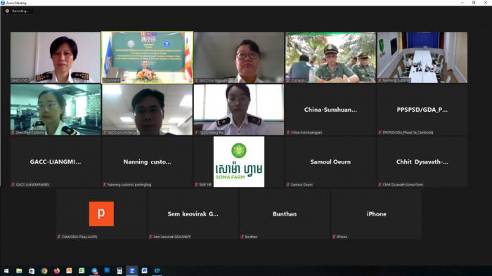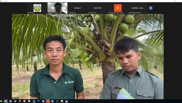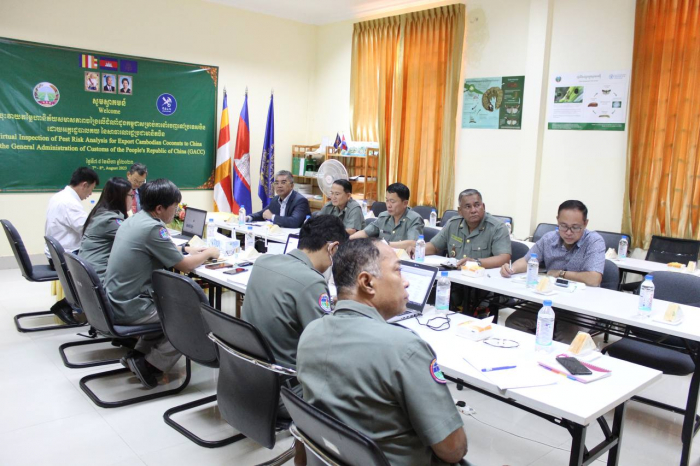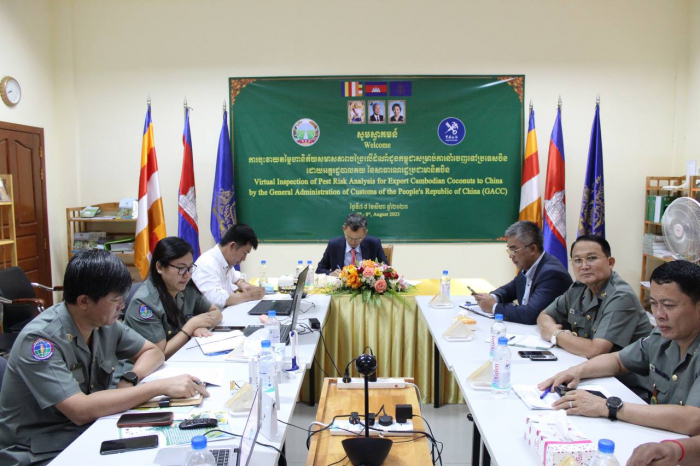 នាថ្ងៃទី៧ ខែសីហា ឆ្នាំ២០២៣ លោកបណ្ឌិត ម៉ាក់ សឿន អគ្គនាយករងនៃអគ្គនាយកដ្ឋានកសិកម្ម បាន ដឹកនាំក្រុមការងារនៃនាយកដ្ឋានការពារ ដំណាំ អនាម័យ និង ភូតគាមអនាម័យ បានចូលរួមវាយតម្លៃហានិភ័យសមាសភាពចង្រៃលើដំណាំដូងកម្ពុជាសម្រាប់ការនាំចេញទៅកាន់ប្រទេសចិន តាមរយៈប្រព័ន្ធវីដេអូពីចម្ងាយ ដោយក្រុមការងារជំនាញនៃអគ្គរដ្ឋបាលគយ នៃសាធារណរដ្ឋប្រជាមានិតចិន (GACC) ដែលដឹកនាំដោយលោកស្រី Chen Yongqing មន្រ្តីគយជាន់ខ្ពស់ប្រចាំខេត្តក្វាងចូវ ក្រុមការងារជំនាញនៃអគ្គនាយកដ្ឋានកសិកម្ម និងតំណាងស្ថានទូតចិនប្រចាំប្រទេសកម្ពុជាដឹកនាំដោយ Dr.Wang Xiangshe មន្រ្តីជាន់ខ្ពស់ស្ថានទូតចិនប្រចាំនៅកម្ពុជាទទួលបន្ទុកការងារកសិកម្ម ដែលនឹងប្រព្រឹត្តទៅចំនួន២ថ្ងៃ ចាប់ពីថ្ងៃទី៧ ដល់ថ្ងៃទី៨ ខែសីហា ឆ្នាំ២០២៣ ដើម្បីឈានដល់ការរៀបចំនិងការចុះហត្ថលេខាលើពិធីសារស្ដីពីលក្ខខណ្ឌតម្រូវភូតគាមអនាម័យសម្រាប់ការនាំចេញផ្លែដូងស្រស់ពីកម្ពុជាទៅកាន់ប្រទេសចិន។