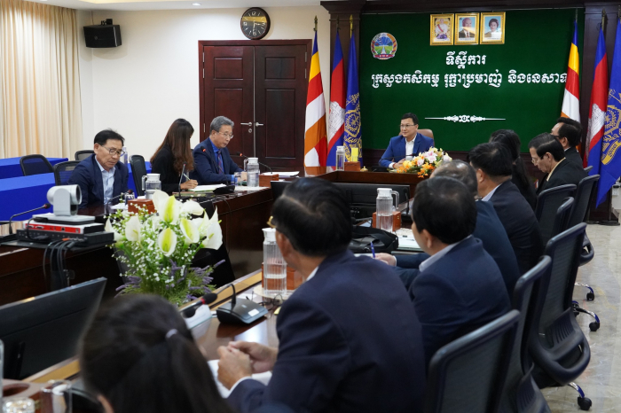 នៅរសៀលថ្ងៃទី២៧ ខែមេសា ឆ្នាំ២០២៣ ឯកឧត្តម ឌិត ទីណា រដ្ឋមន្ត្រីក្រសួងកសិកម្ម រុក្ខាប្រមាញ់ និងនេសាទ និងថ្នាក់ដឹកនាំ បានទទួលជួបសម្តែងការគួរសម និងពិភាក្សាការងារជាមួយលោក Song Yong-Ju ប្រធានមជ្ឈមណ្ឌល KOPIA Cambodia Center នៅទីស្តីការក្រសួងកសិកម្ម រុក្ខាប្រមាញ់ និងនេសាទ។