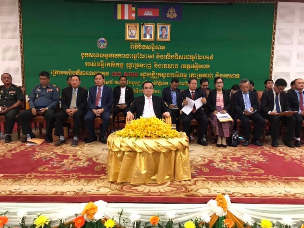នាព្រឹកថ្ងៃសៅរ៍ ០៥រោច ខែបុស្ស ឆ្នាំច សំរឹទ្ធិស័ក ព.ស ២៥៦២ ត្រូវនឹងថ្ងៃទី២៦ ខែមករា ឆ្នាំ ២០១៩ នៅទីស្នាក់ការរដ្ឋបាលខេត្តសៀមរាប មានការៀបចំពិធីបិទសន្និបាតបូកសរុបការងាររបស់ខ្លួនឆ្នាំ២០១៨ និងលើកទិសដៅអនុវត្តបន្តឆ្នាំ២០១៩ របស់មន្ទីកសិកម្ម រុក្ខាប្រមាញ់ និងនេសាទខេត្តសៀមរាប ក្រោមអធិបតិភាពឯកឧត្តម វេង សាខុន រដ្ឋមន្រ្តីក្រសួងកសិកម្ម រុក្ខាប្រមាញ់ និងនេសាទ អមដោយឯកឧត្តម លោកជំទាវជាថ្នាក់ដឹកនាំក្រសួង ឯកឧត្តមពិន ប្រាកដ អភិបាលរងនៃគណអភិបាលខេត្ត ឯកឧត្តមសមាជិកក្រុមប្រឹក្សាខេត្ត អភិបាលក្រុង ស្រុក លោក លោកស្រីតំណាងមន្ទីរជុំវិញខេត្ត មន្រ្តីរាជការប្រមាណជាង ៤៥០នាក់។