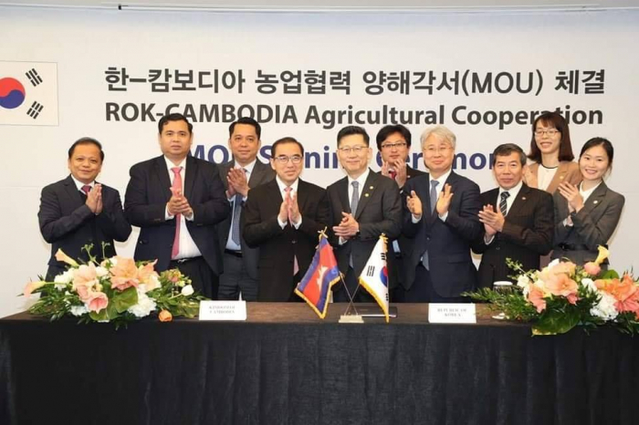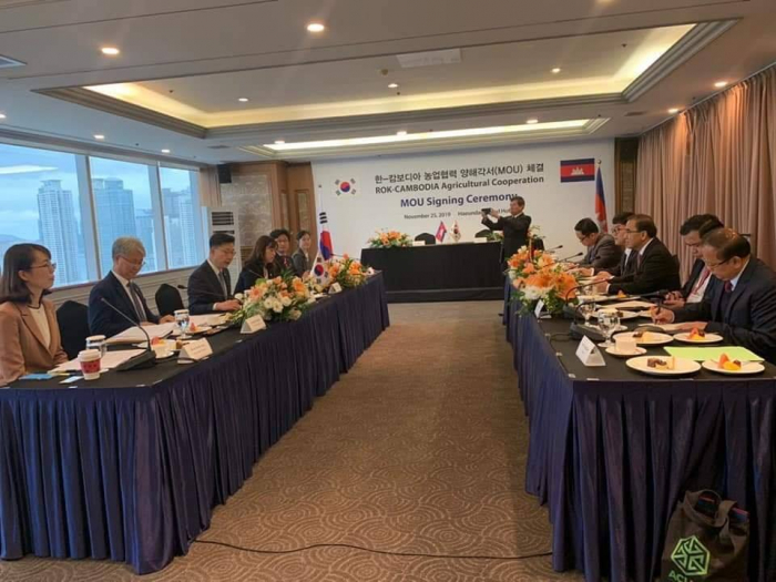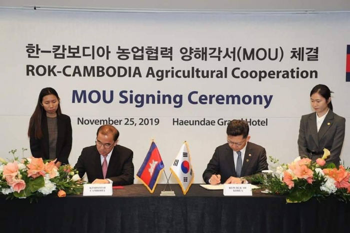 នៅសណ្ឋាគារ Grand Haeundea នៅទីក្រុងប៊ូសាន នារសៀលថ្ងៃច័ន្ទ ១៤រោច ខែកក្តិក ឆ្នាំកុរ ឯកស័ក ព.ស២៥៦៣ ត្រូវនឹងថ្ងៃទី២៥ ខែវិច្ឆិកា ឆ្នាំ ២០១៩ ឯកឧត្តម វេង សាខុន រដ្ឋមន្ត្រី ក្រសួងកសិកម្ម រុក្ខាប្រមាញ់ និងនេសាទ បានជួបពិភាក្សាការងារ ជាមួយឯកឧត្តម Kim Hyeon-Soo រដ្ឋមន្ត្រីក្រសួងកសិកម្ម ស្បៀងអាហារ និងអភិវឌ្ឍន៍ជនបទនៃសាធារណៈរដ្ឋកូរ៉េ ដើម្បីពង្រឹងកិច្ចសហប្រតិបត្តិការ និងចុះហត្ថលេខាលើអនុស្សរណៈនៃការយោគយល់គ្នាស្តីពីកិច្ចសហប្រតិបត្តិការក្នុងវិស័យកសិកម្ម រវាងក្រសួងកសិកម្ម រុក្ខាប្រមាញ់ និងនេសាទ នៃព្រះរាជាណាចក្រកម្ពុជា និងក្រសួងកសិកម្ម ស្បៀងអាហារ និងកិច្ចការជនបទ នៃសាធារណរដ្ឋកូរ៉េ ។ សូមបញ្ជាក់ថា៖ ក្នុងគោលបំណងពង្រឹងកិច្ចសហប្រតិបត្តិការ និងការអភិវឌ្ឍទំនាក់ទំនងទ្វេភាគីរបស់ភាគីទាំងពីរនៅក្នុងវិស័យកសិកម្ម និងដោយមើលឃើញពីតម្រូវការចាំបាច់សម្រាប់ការប្រើប្រាស់ធនធានធម្មជាតិប្រកបដោយប្រសិទ្ធភាពនិងការអភិវឌ្ឍធនធានមនុស្ស និងដោយមានបំណងចង់ពង្រឹងកិច្ចសហប្រតិបត្តិការរវាងវិស័យសាធារណៈ និងឯកជននៃប្រទេសទាំងពីរលើវិស័យកសិកម្ម។ ភាគីទាំងពីរបានព្រមព្រៀងគ្នាលើកិច្ចសហការគ្នាក្នុងវិស័យដូចខាងក្រោម៖