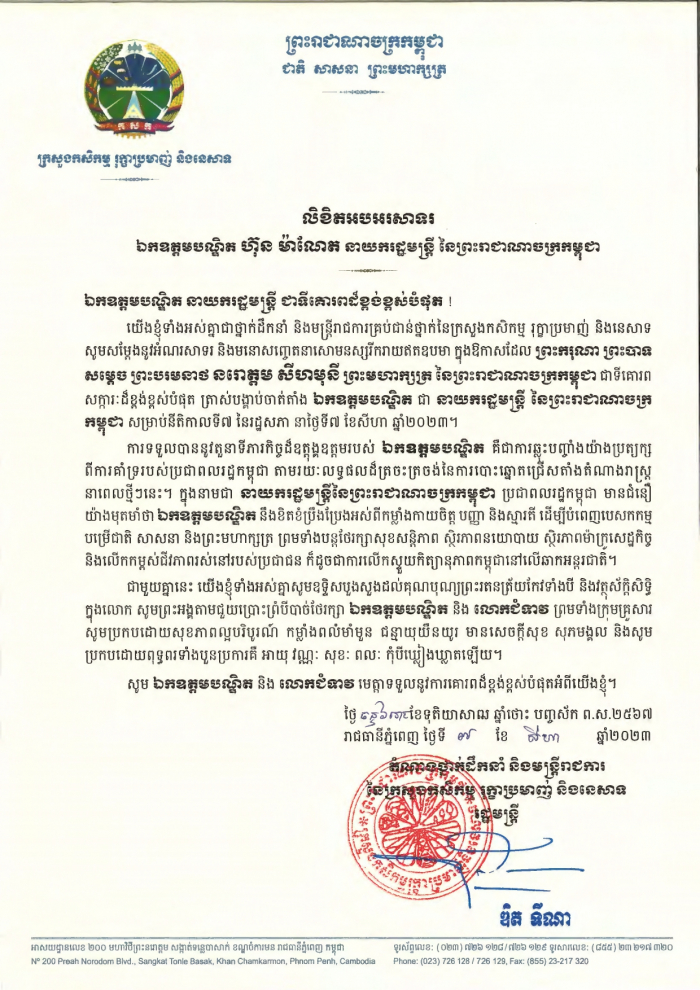 លិខិតអបអរសាទរ ឯកឧត្ដមបណ្ឌិត ហ៊ុន ម៉ាណែត