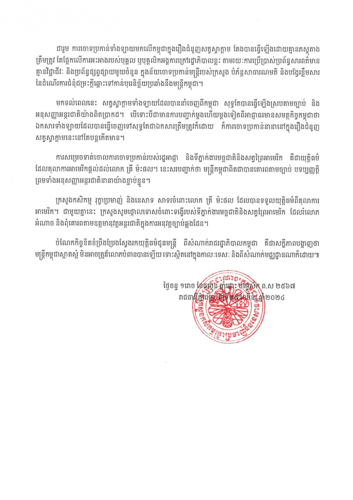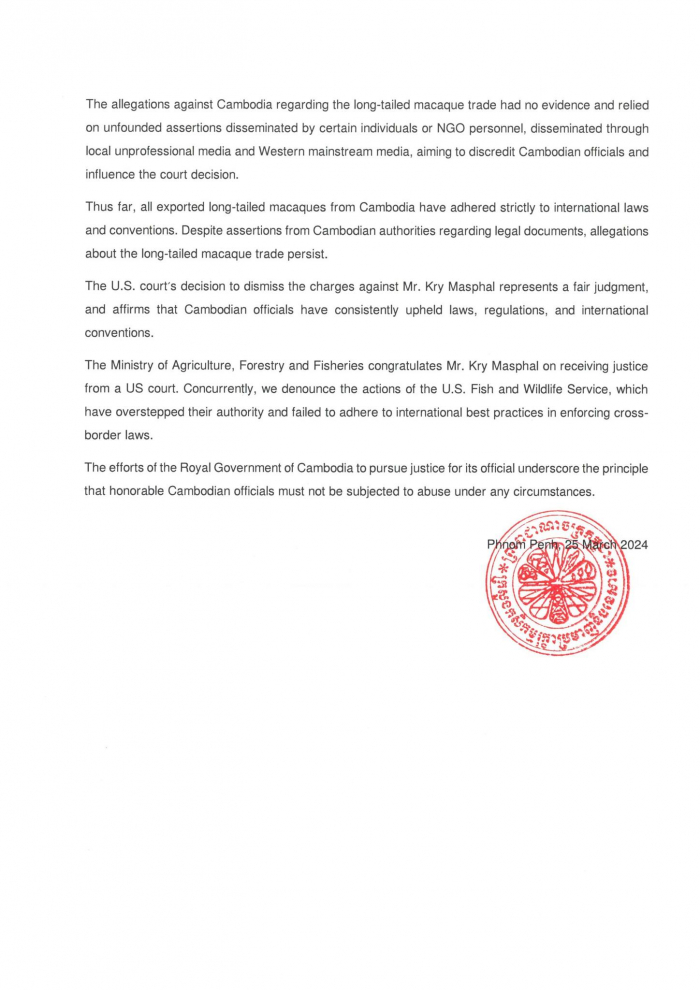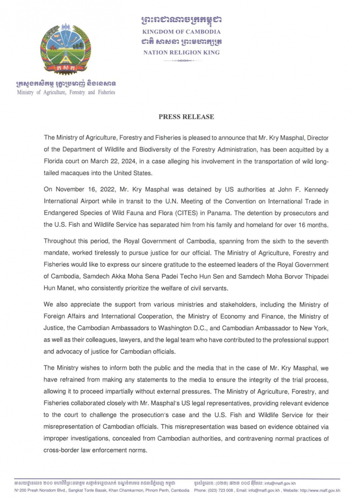 សេចក្តីប្រកាសព័ត៌មាន ស្តីពី លោក គ្រី ម៉ះផល ប្រធាននាយកដ្ឋានសត្វព្រៃនិងជីវចម្រុះ នៃរដ្ឋបាលព្រៃឈើ ត្រូវបានតុលាការអាមេរិកសម្រេចថាគ្មានទោសនៅក្នុងសំណុំរឿងសមគំនិតក្នុងការរត់ពន្ធសត្វស្វាក្តាមទៅកាន់សហរដ្ឋអាមេរិក