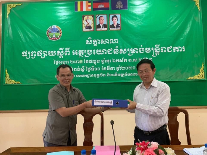នៅថ្ងៃអង្គារ  ២រោច ខែផល្គុន ឆ្នាំកុរ​ ឯកស័ក​ ព.ស.២៥៦៣​ ត្រូវនឹងថ្ងៃទី១០ ខែមីនា ឆ្នាំ២០២០ ក្រុមការងារនៃនាយកដ្ឋានបុគ្គលិកនិងអភិវឌ្ឍន៍ធនធានមនុស្ស​ ដឹកនាំដោយលោក​ កោះ​ ឈីណូ​ អនុប្រធាននាយកដ្ឋាន​ បានរៀបចំសិក្ខាសាលាផ្សព្វផ្សាយស្តីពី​ អត្ថប្រយោជន៍សម្រាប់មន្ត្រីរាជការ​ ដល់ថ្នាក់ដឹកនាំមន្ទីរ​ និងលោក​ លោកស្រី​ នាងកញ្ញា​ ជាមន្ត្រីរាជការបម្រេីការងារនៅមន្ទីរកសិកម្ម​ រុក្ខាប្រមាញ់​ និងនេសាទខេត្តកំពង់ស្ពឺ។