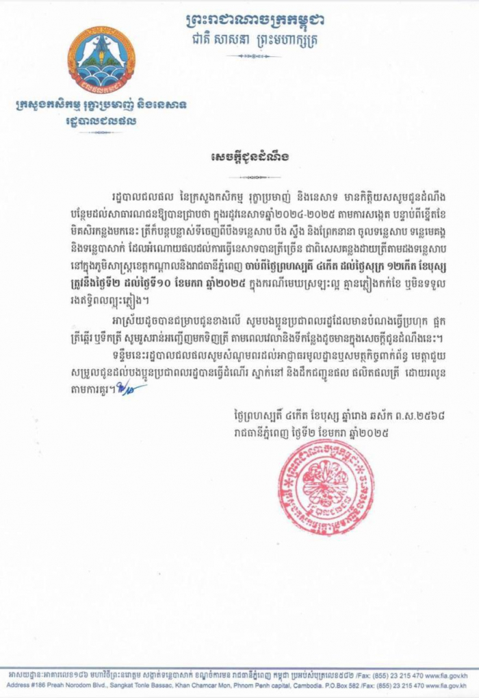 រដ្ឋបាលជលផល អំពាវនាវដល់ប្រជាពលរដ្ឋ ដែលចង់ធ្វើប្រហុក ផ្អក ត្រីឆ្អើរ ឬទឹកត្រី សូមរួសរាន់អញ្ជើញមកទិញត្រី ចាប់ពីថ្ងៃនេះដល់ថ្ងៃទី១០ ខែមករា ឆ្នាំ២០២៥